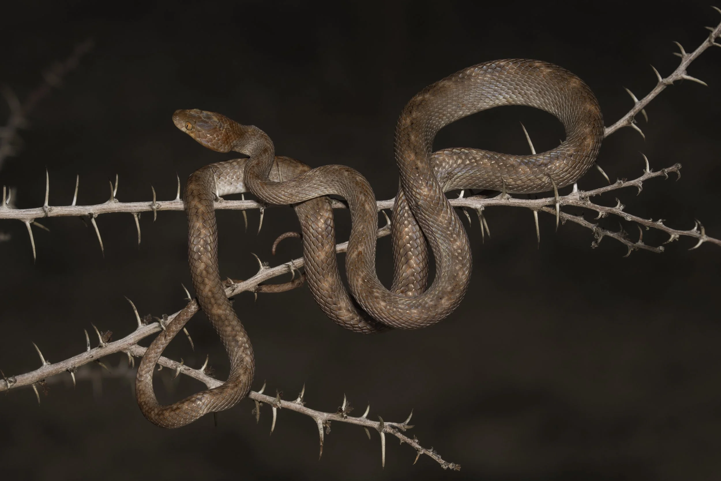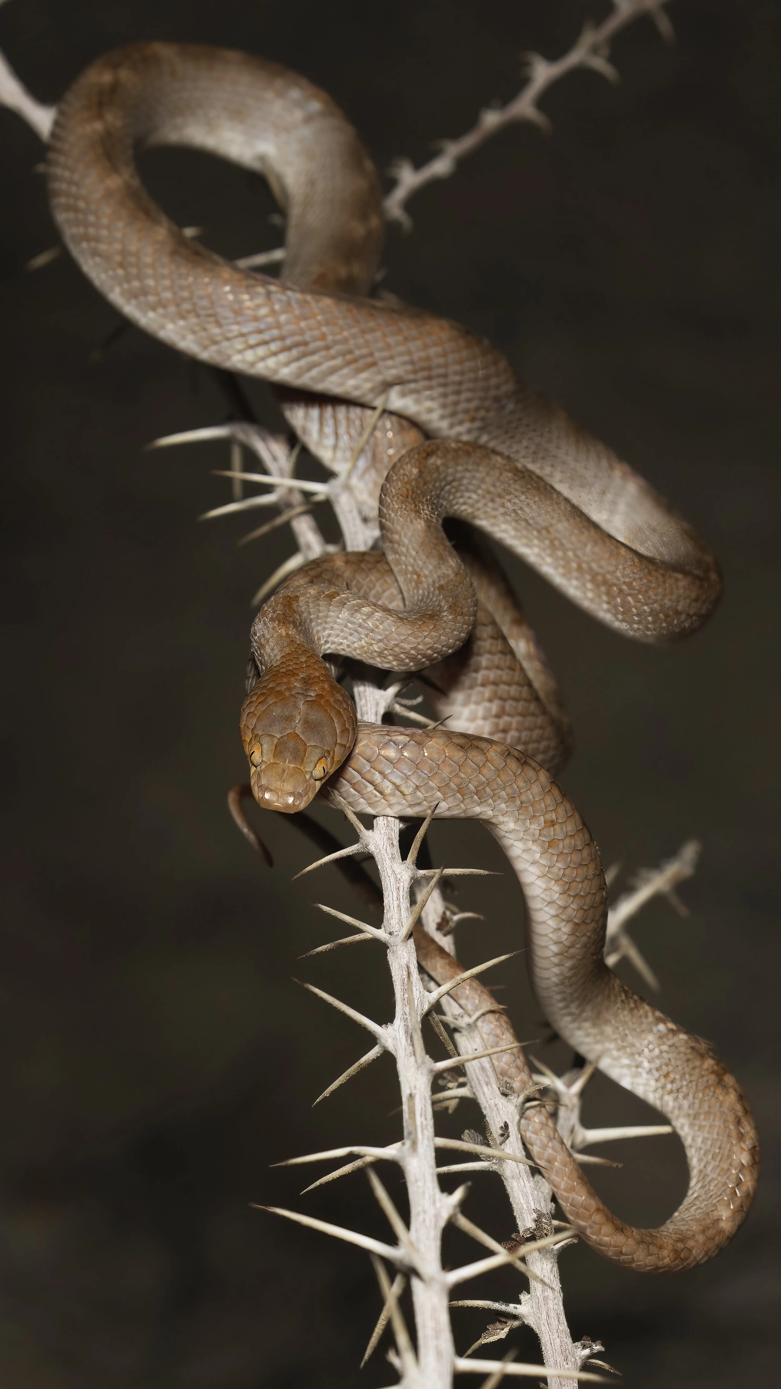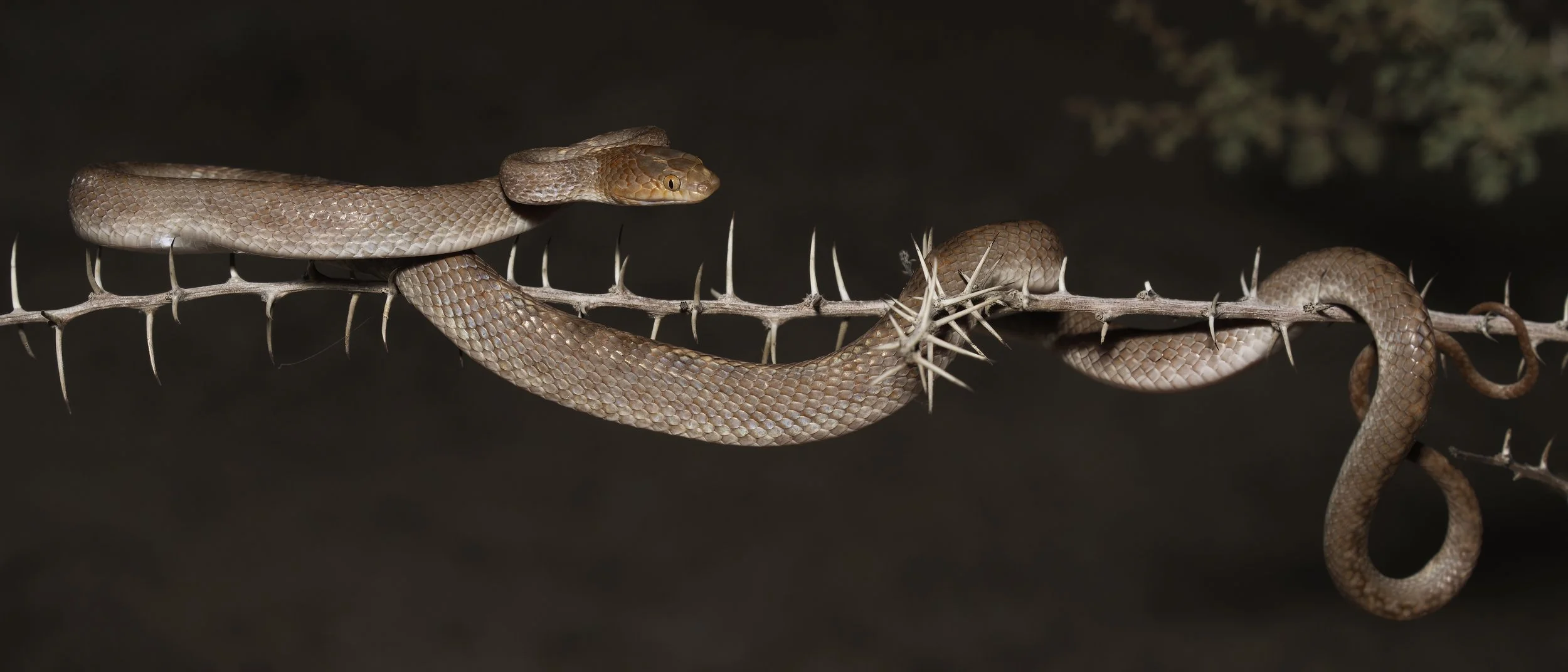 Remarkably agile for its size, the Arabian cat snake is both terrestrial and arboreal: it moves slowly on the ground but is adept at scaling vertical rock faces and scrambling up tree trunks and shrubs to hunt or escape predators.