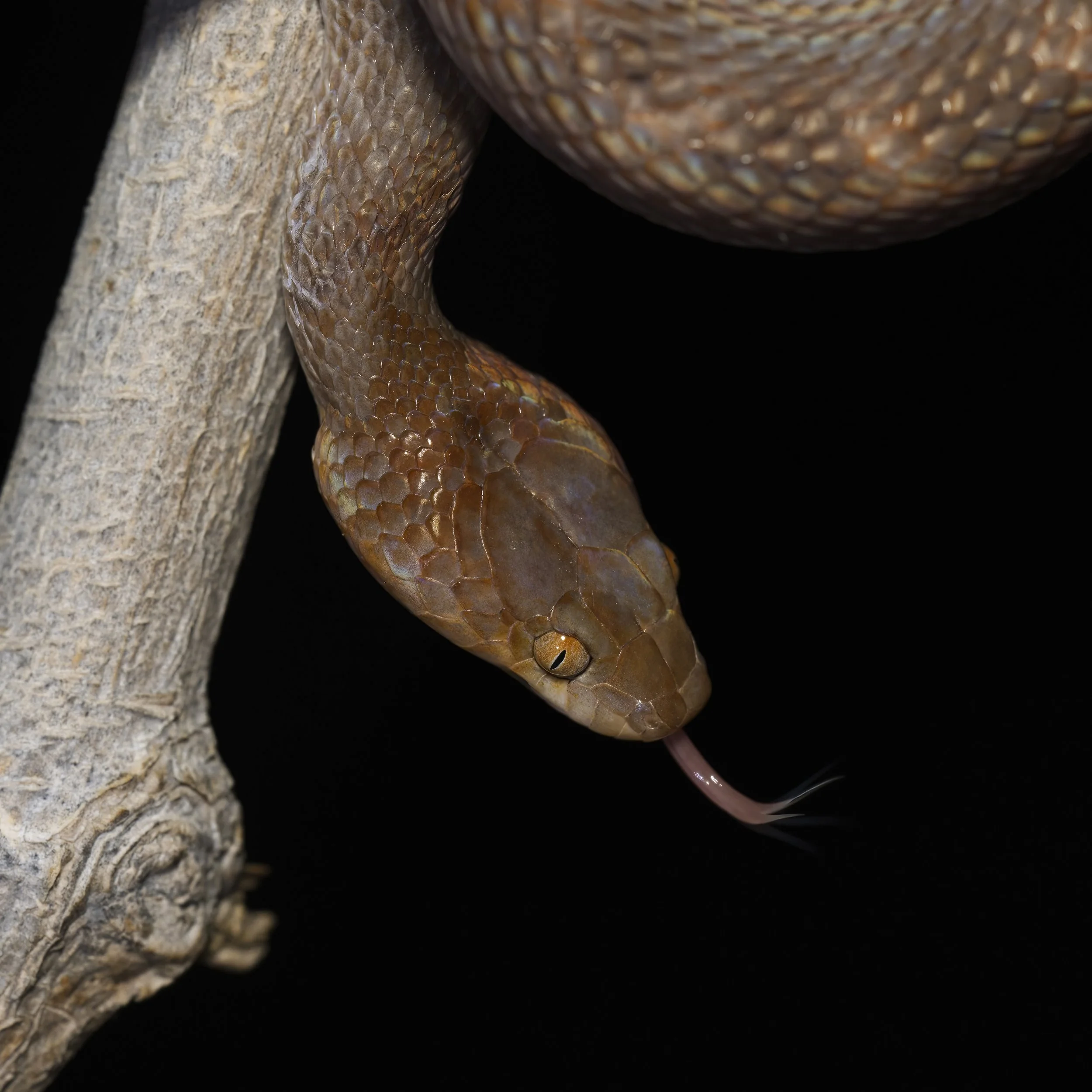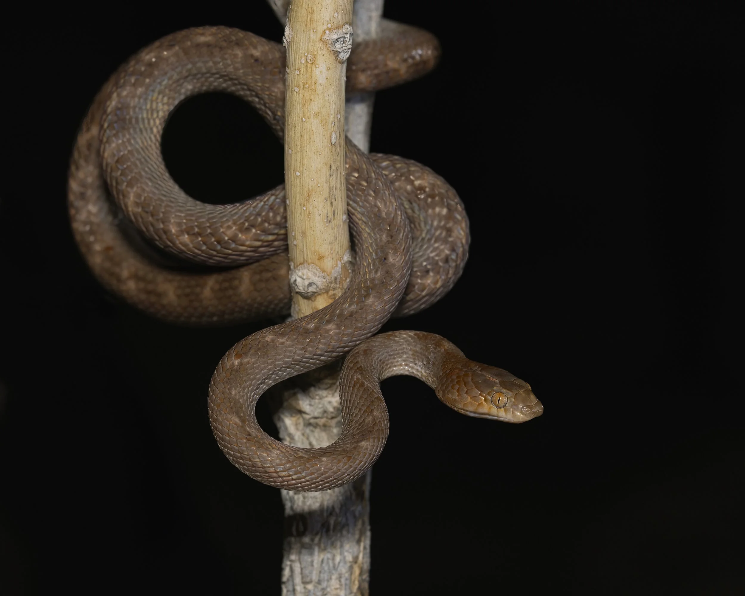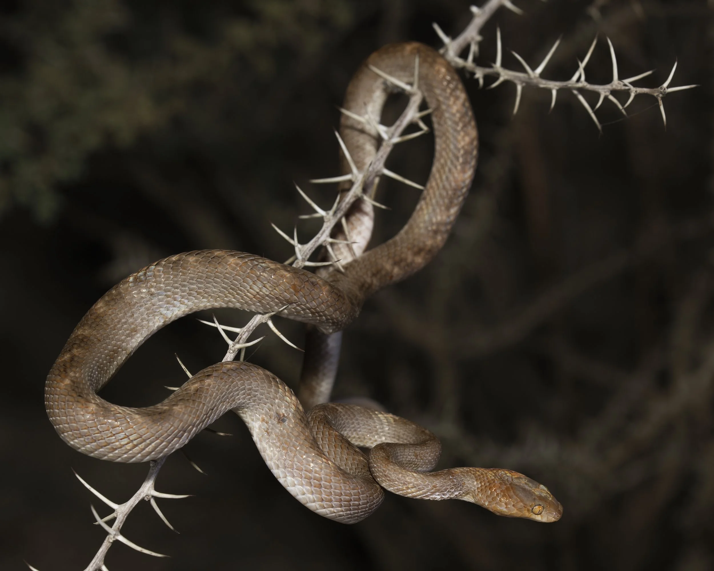 Remarkably agile for its size, the Arabian cat snake is both terrestrial and arboreal: it moves slowly on the ground but is adept at scaling vertical rock faces and scrambling up tree trunks and shrubs to hunt or escape predators.