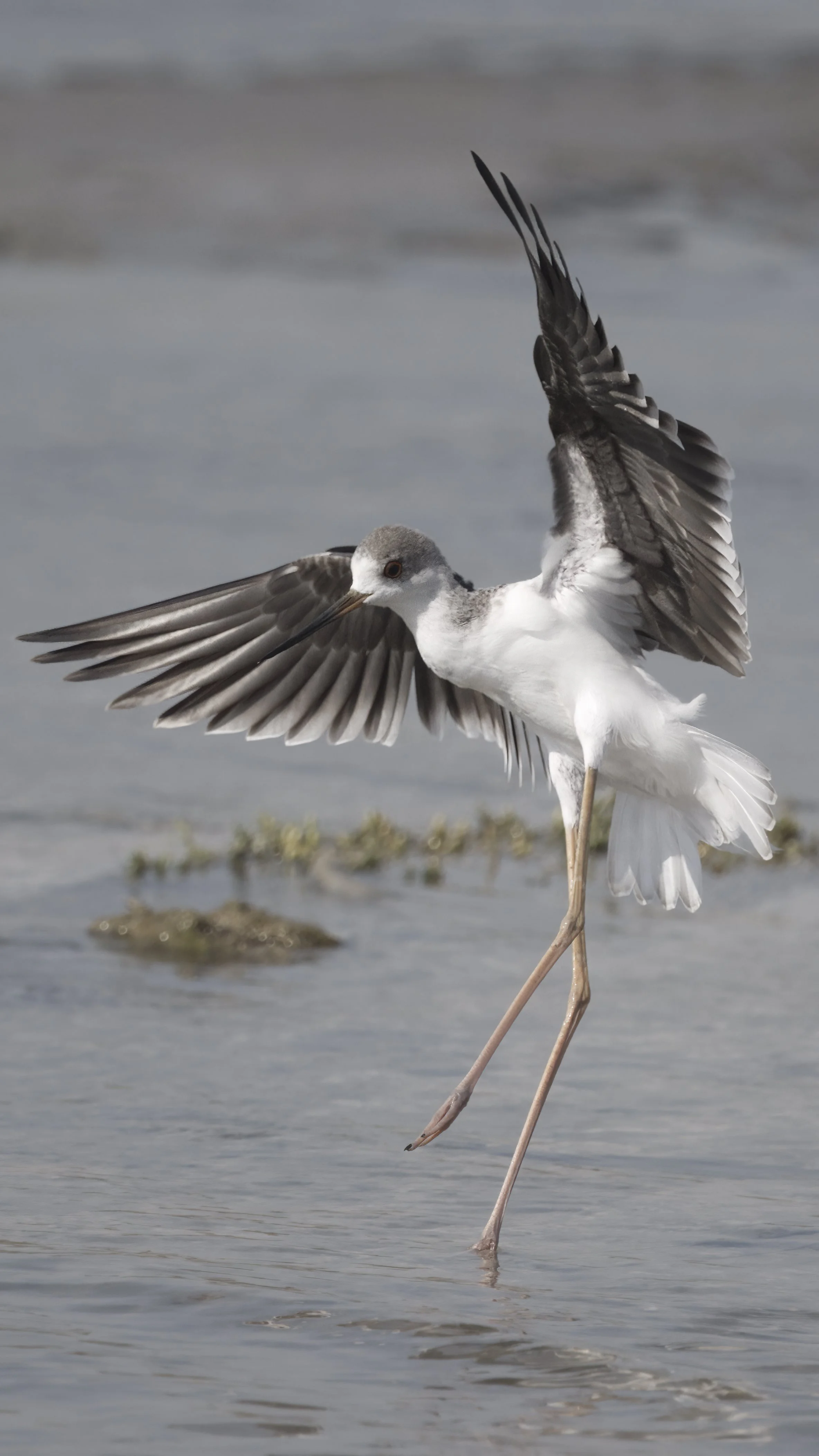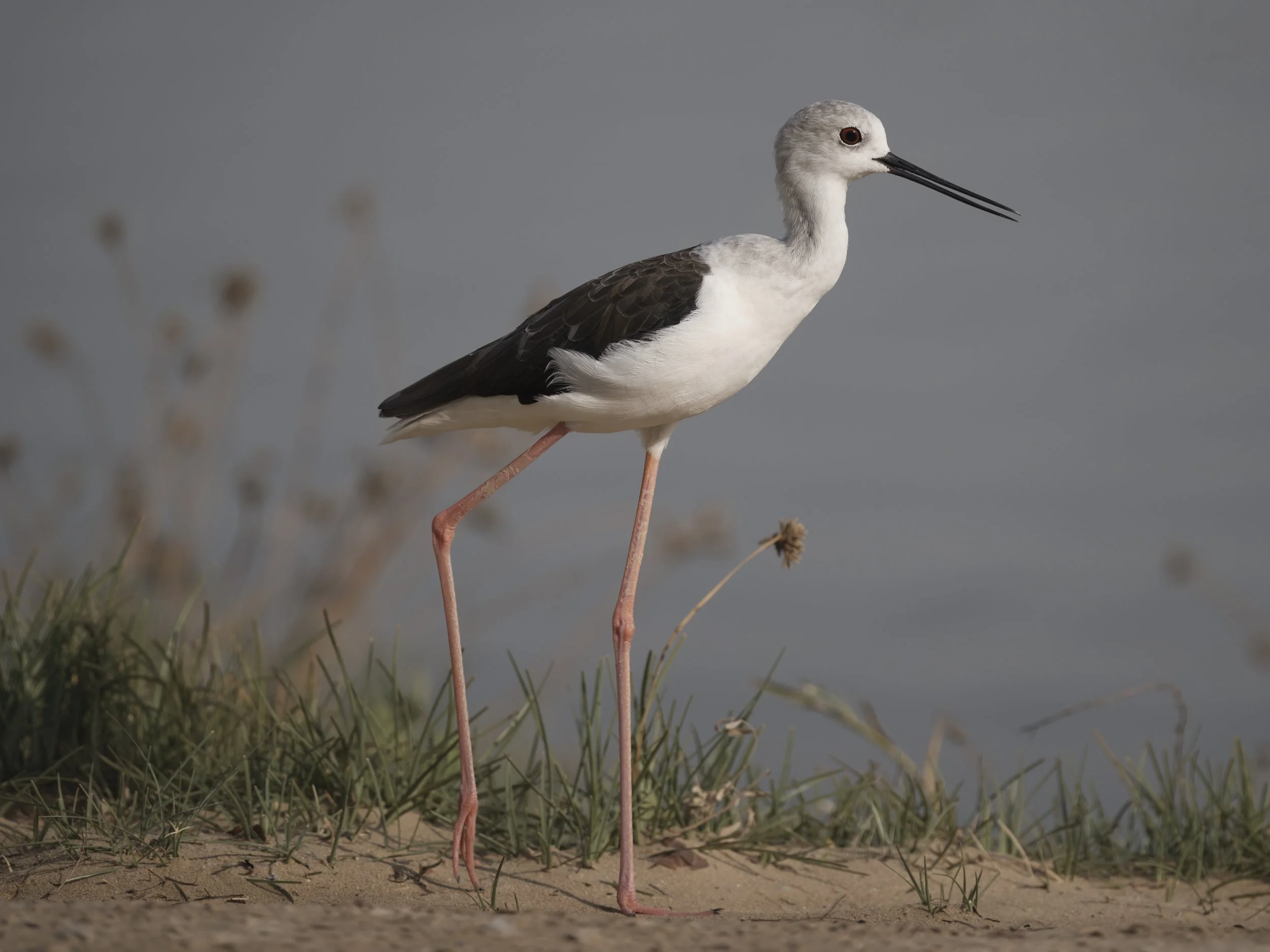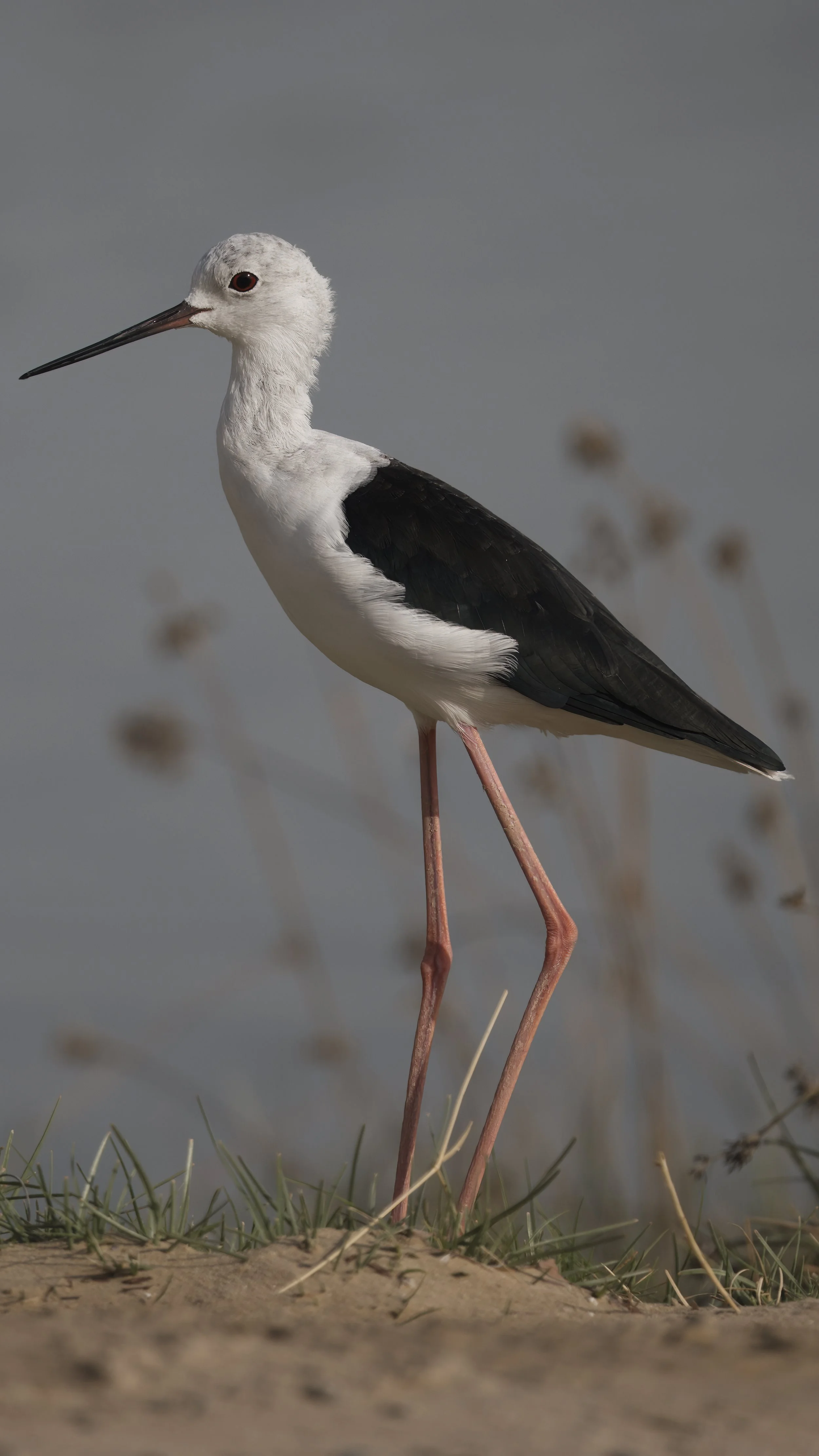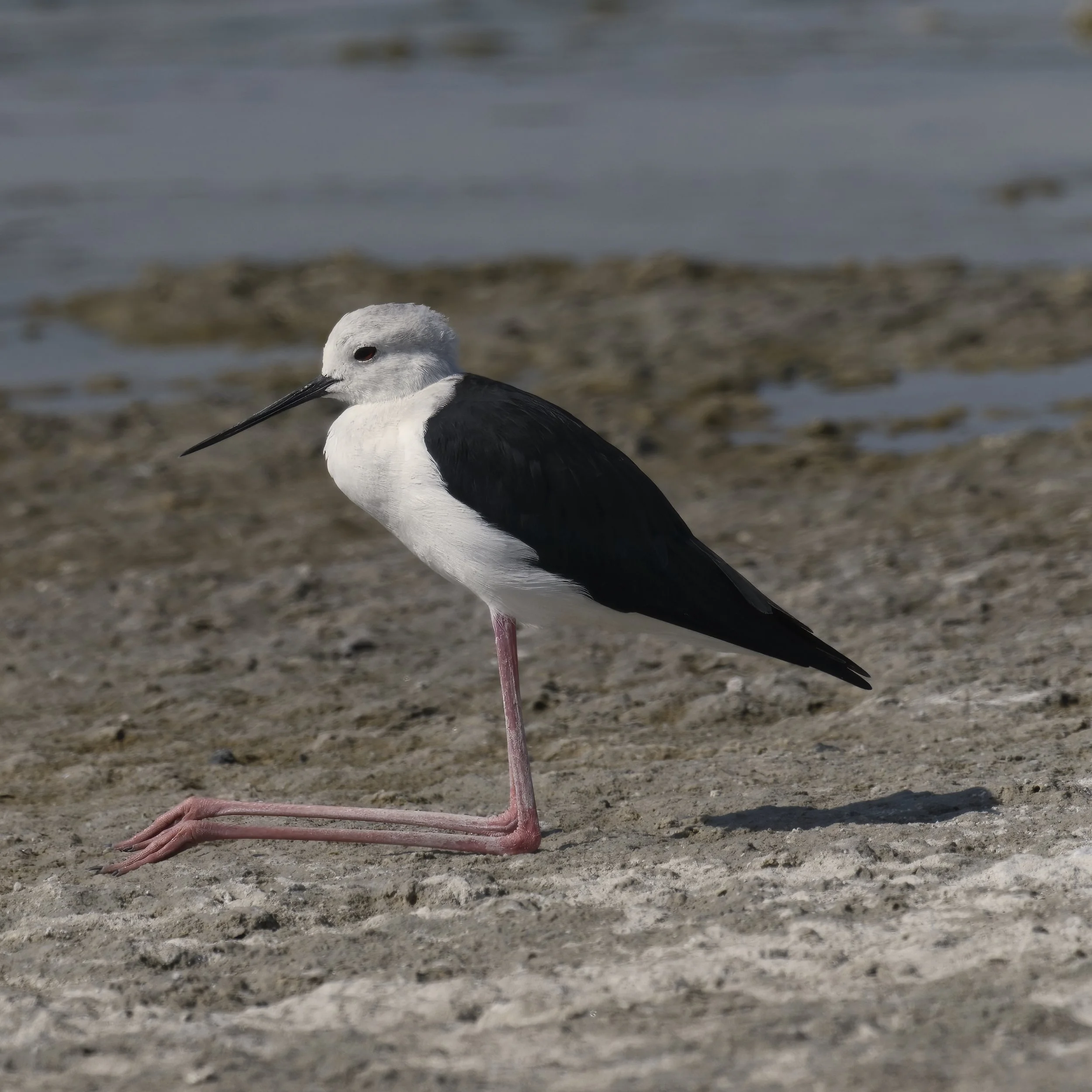 The Black-winged Stilt (Himantopus himantopus) is a striking wader bird known for its long, slender legs and distinctive black-and-white plumage. Found in wetlands, shallow lakes, and marshes, this species is widespread across Europe, Asia, Africa, and Australia, including the United Arab Emirates. The bird is easily recognizable by its stark black wings contrasting against its white body, and its characteristic long pinkish-red legs, which enable it to wade through deeper waters while foraging.