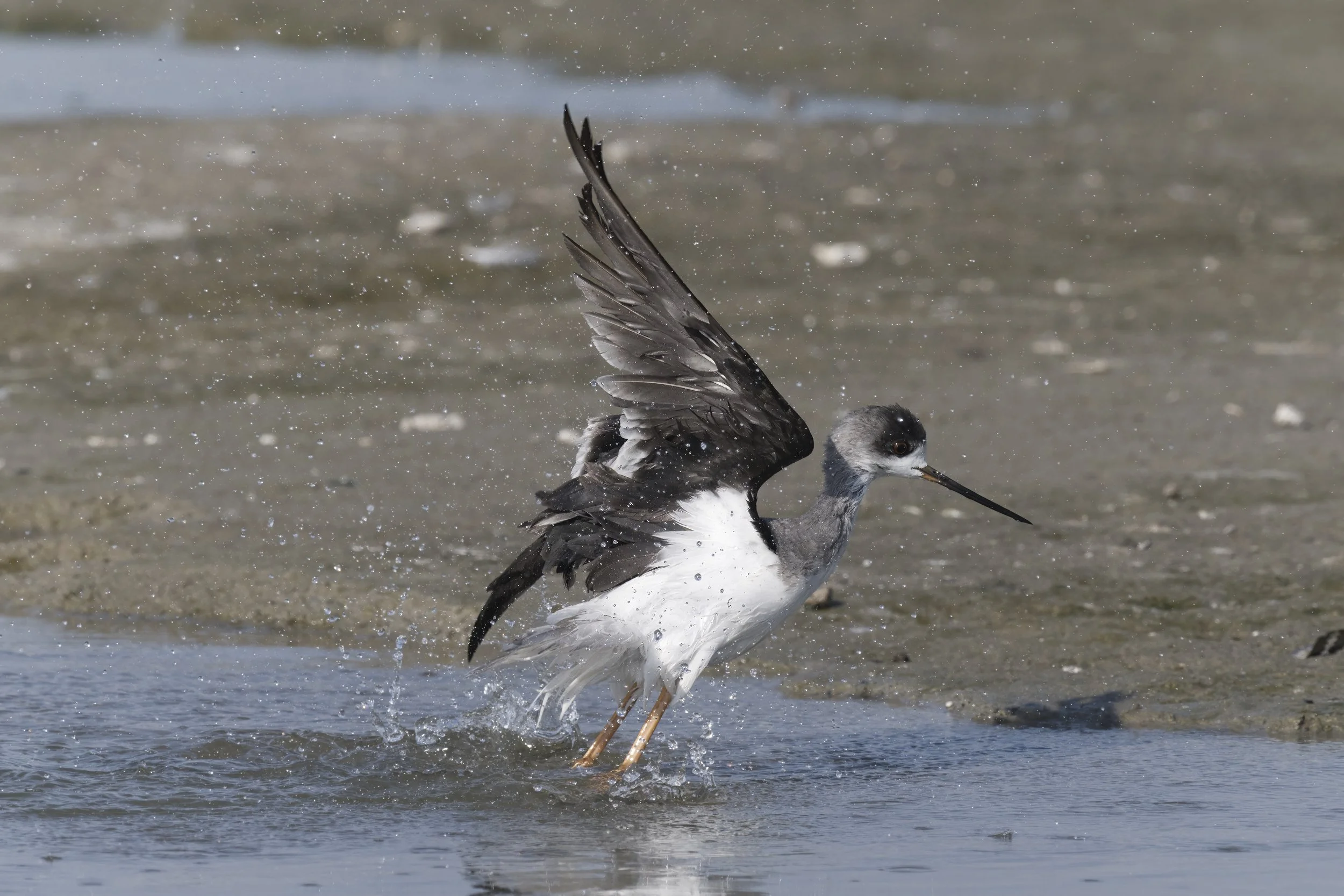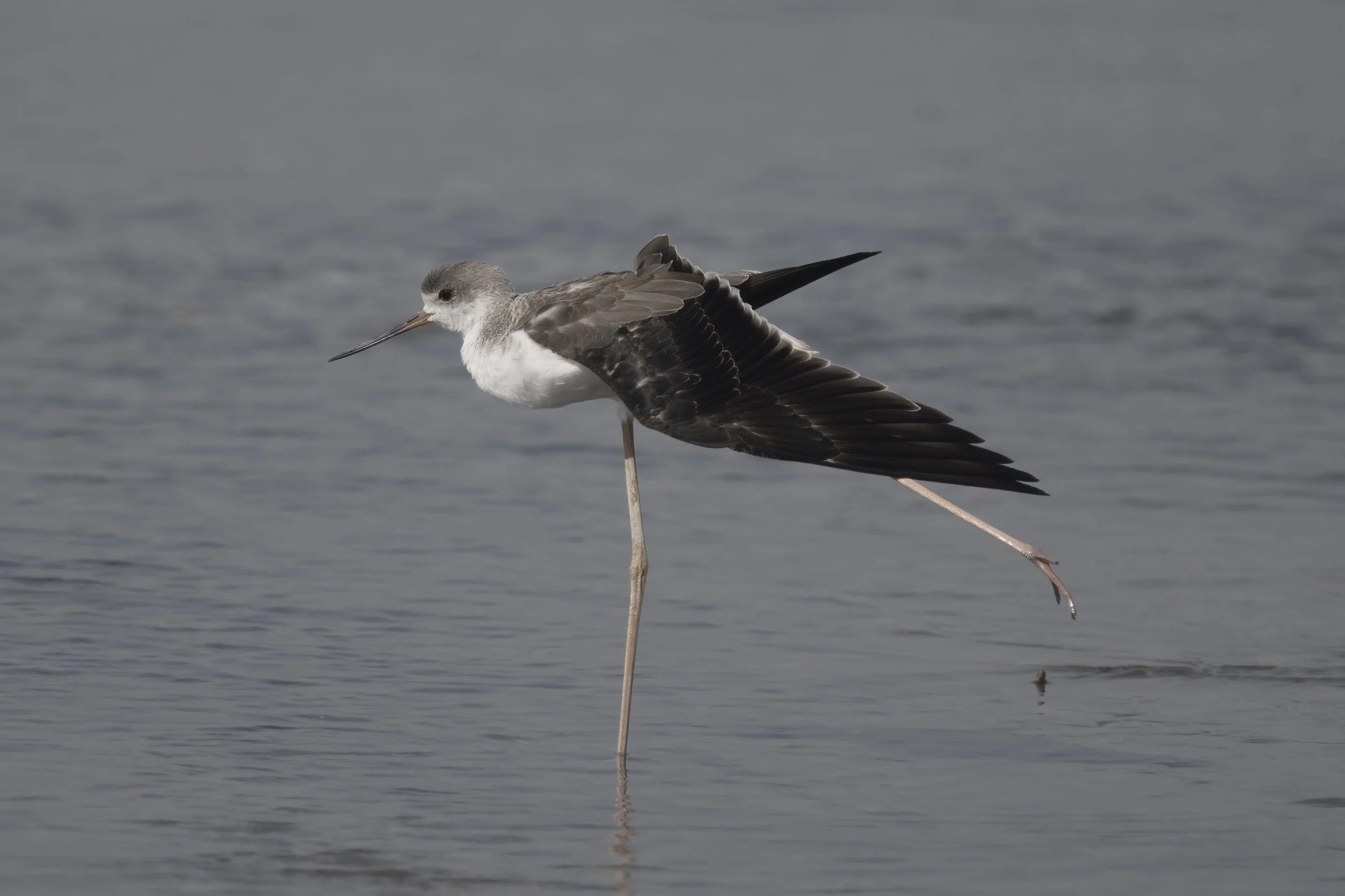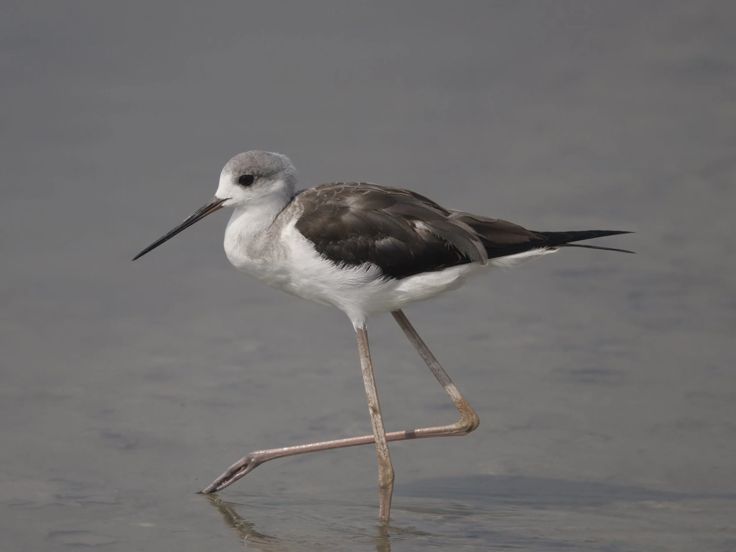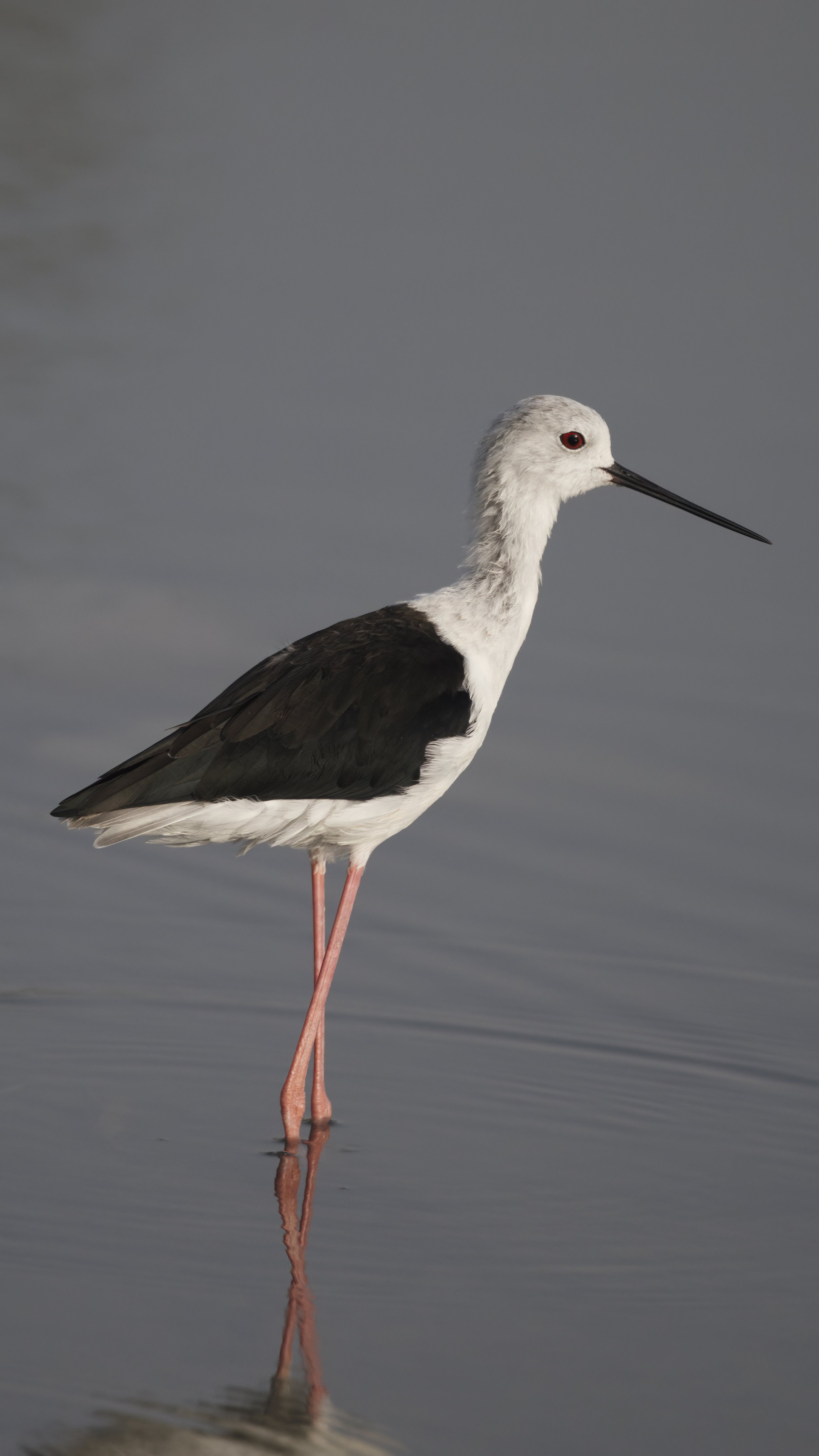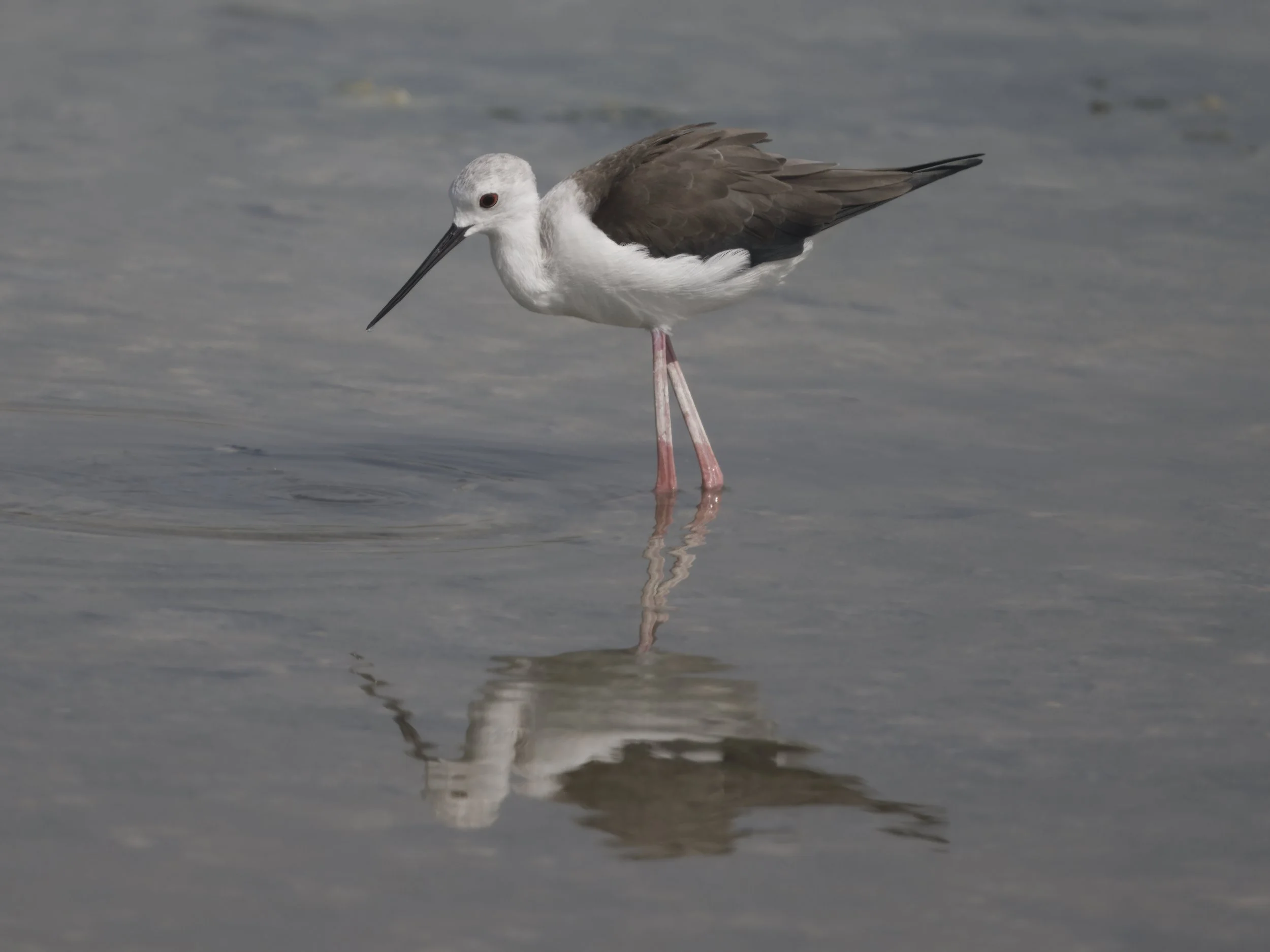 The Black-winged Stilt (Himantopus himantopus) is a striking wader bird known for its long, slender legs and distinctive black-and-white plumage. Found in wetlands, shallow lakes, and marshes, this species is widespread across Europe, Asia, Africa, and Australia, including the United Arab Emirates. The bird is easily recognizable by its stark black wings contrasting against its white body, and its characteristic long pinkish-red legs, which enable it to wade through deeper waters while foraging.