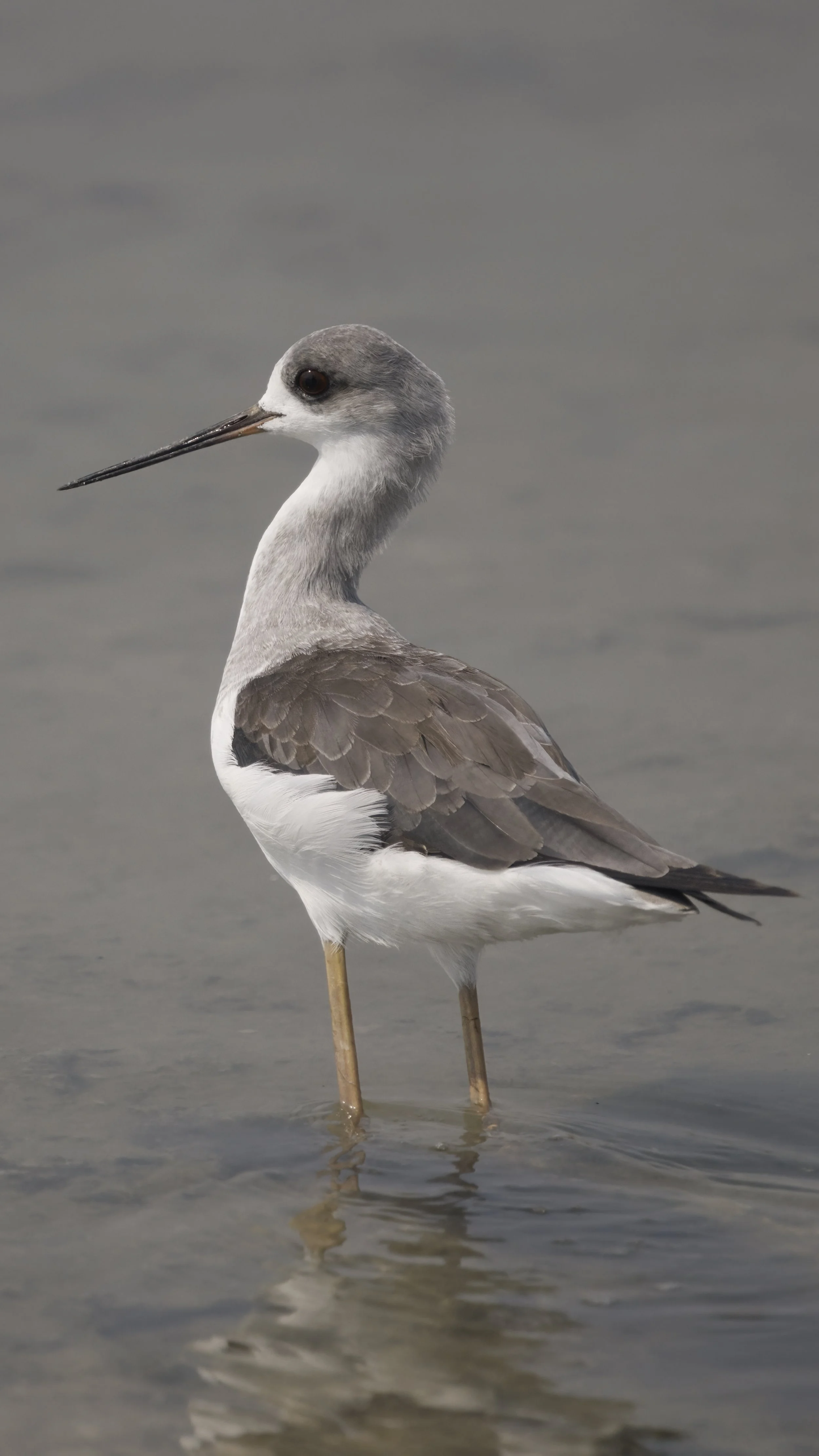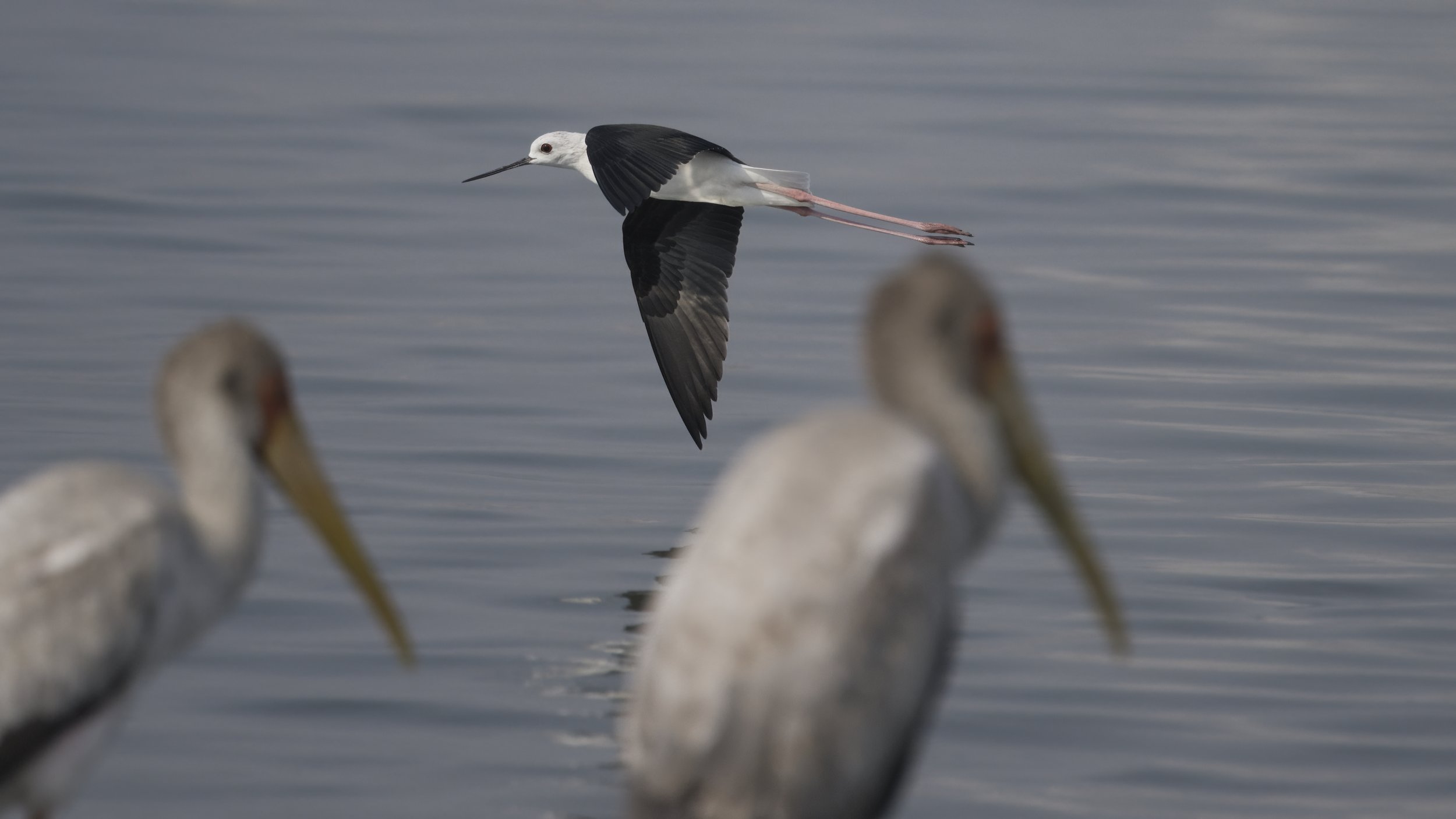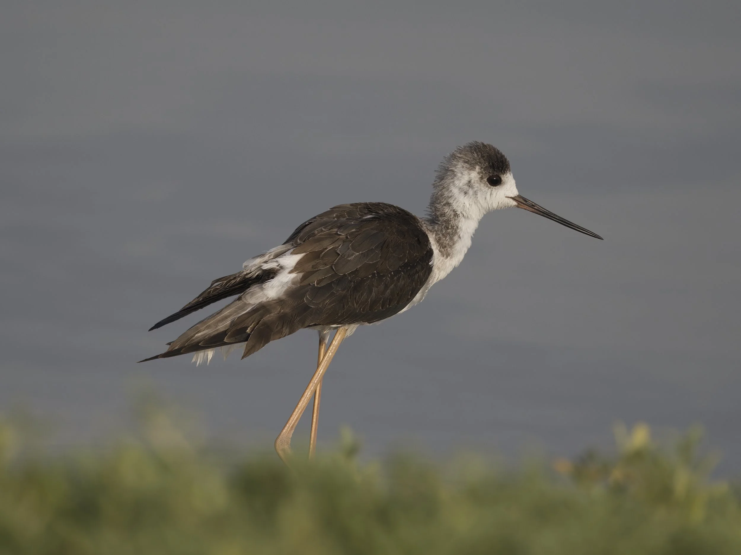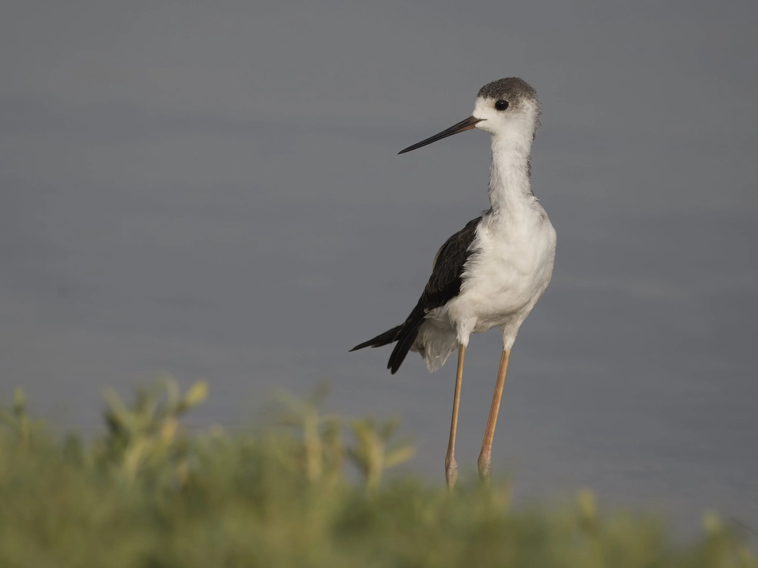 The Black-winged Stilt (Himantopus himantopus) is a striking wader bird known for its long, slender legs and distinctive black-and-white plumage. Found in wetlands, shallow lakes, and marshes, this species is widespread across Europe, Asia, Africa, and Australia, including the United Arab Emirates. The bird is easily recognizable by its stark black wings contrasting against its white body, and its characteristic long pinkish-red legs, which enable it to wade through deeper waters while foraging.