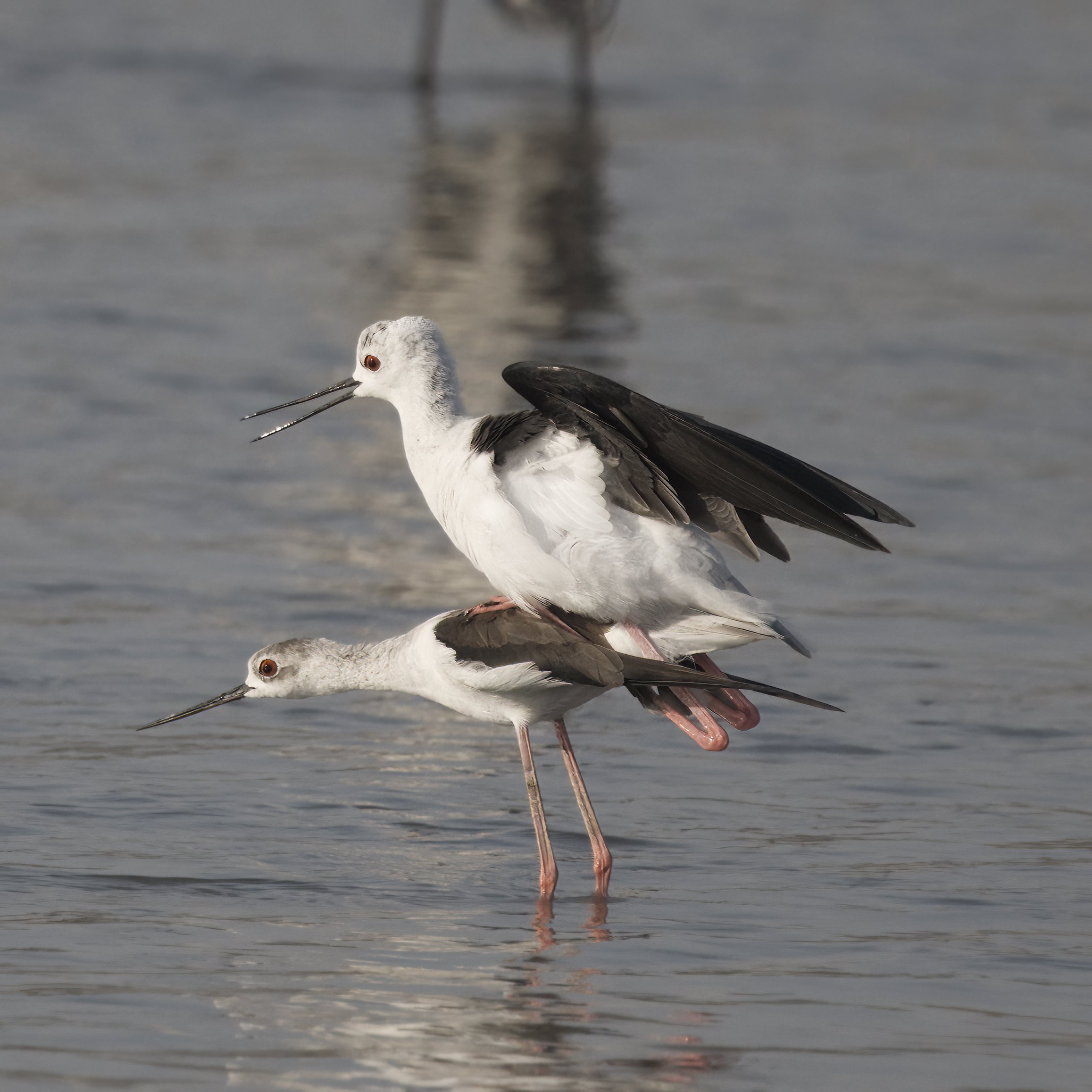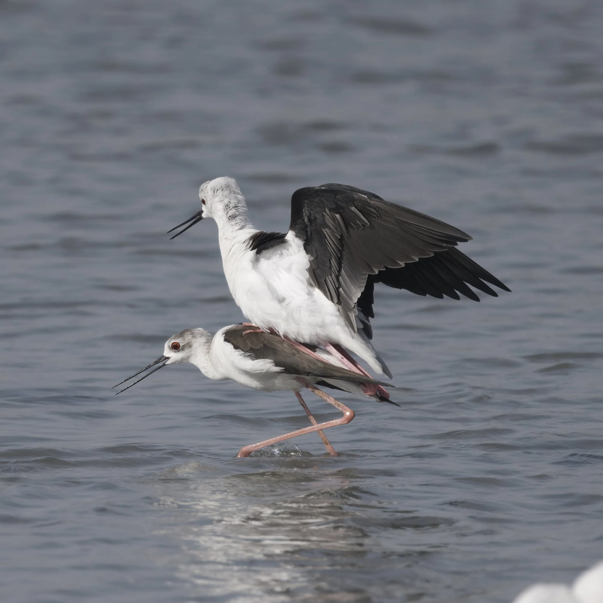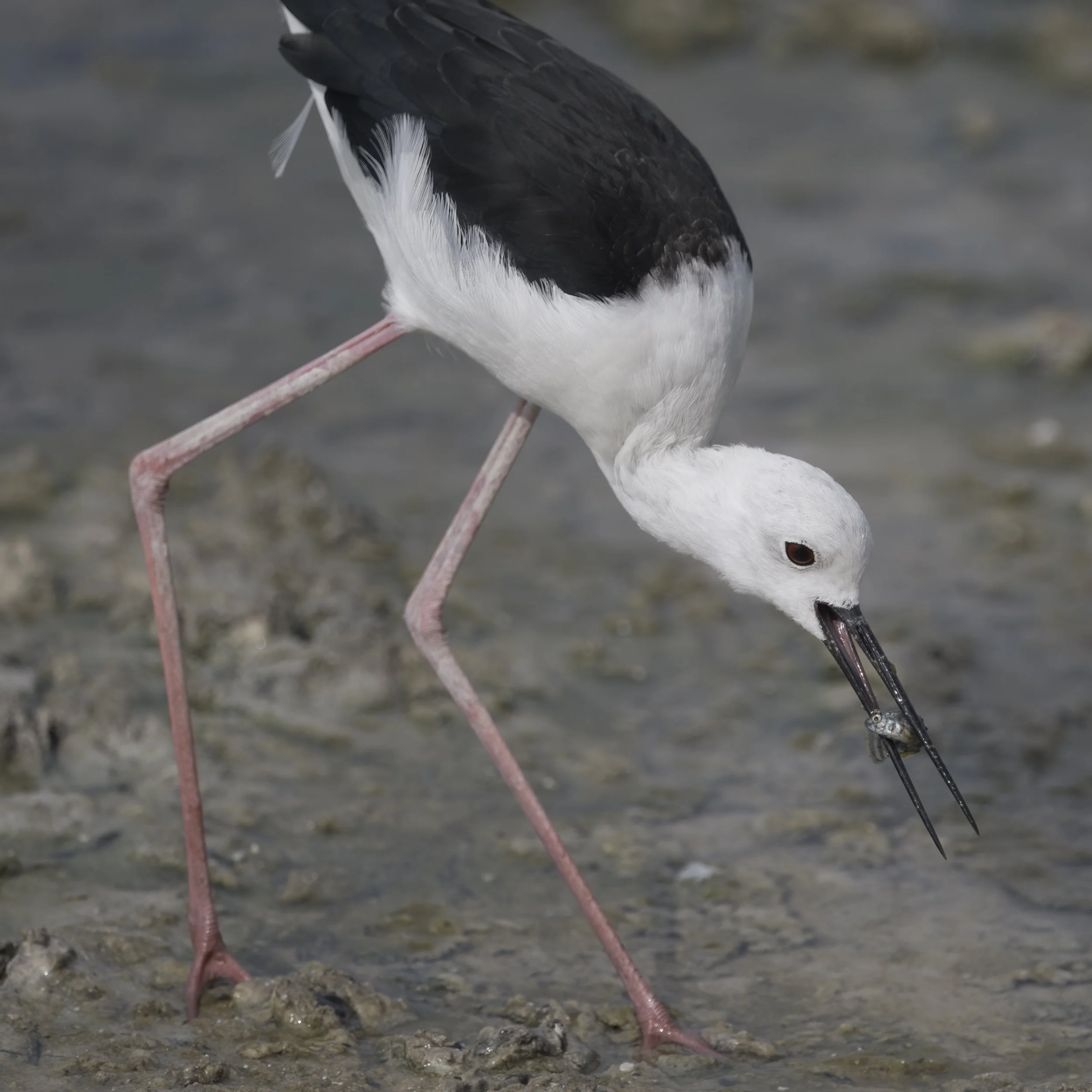 Black-winged Stilts primarily feed on aquatic invertebrates, small fish, and crustaceans, which they pick from the water’s surface with their long, slender bills. During the breeding season, they nest in shallow scrapes on the ground, often close to water bodies, laying eggs that are well-camouflaged against the surrounding environment. These birds are known for their agile flight and social behavior, often seen in small groups or large flocks.