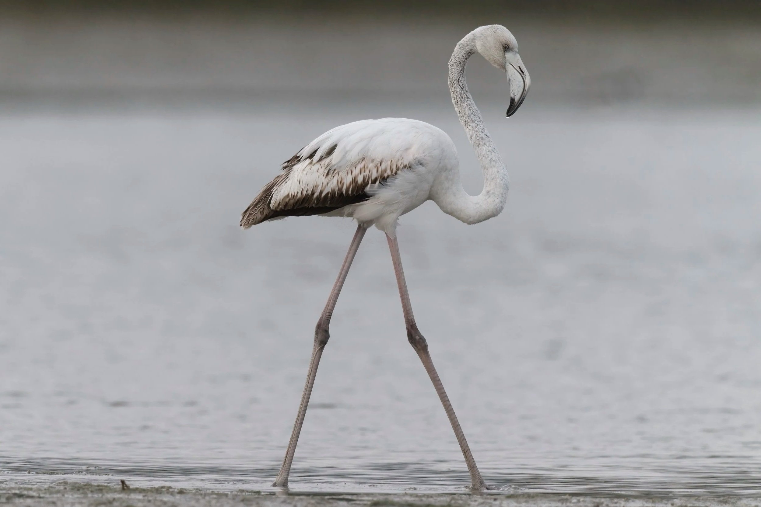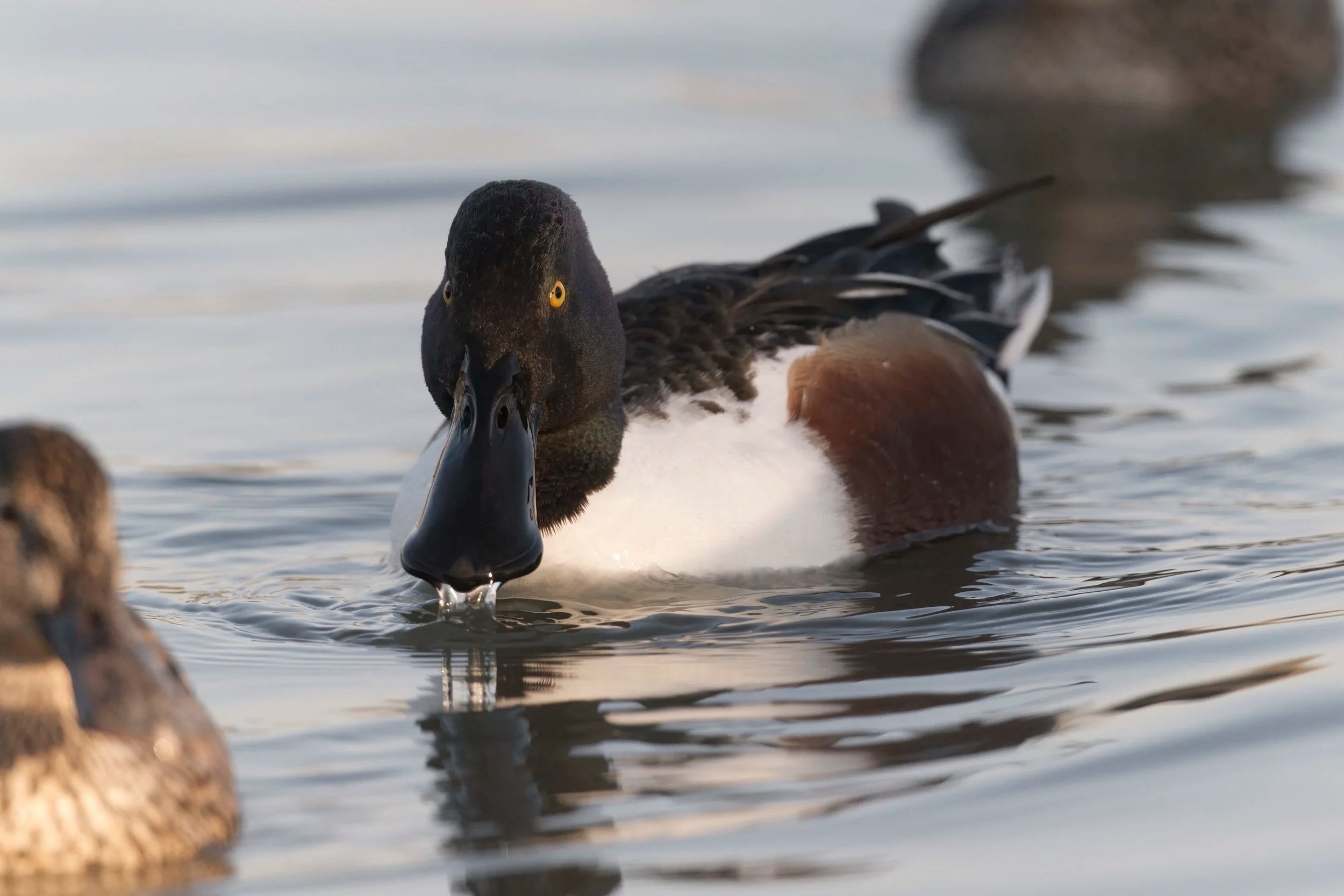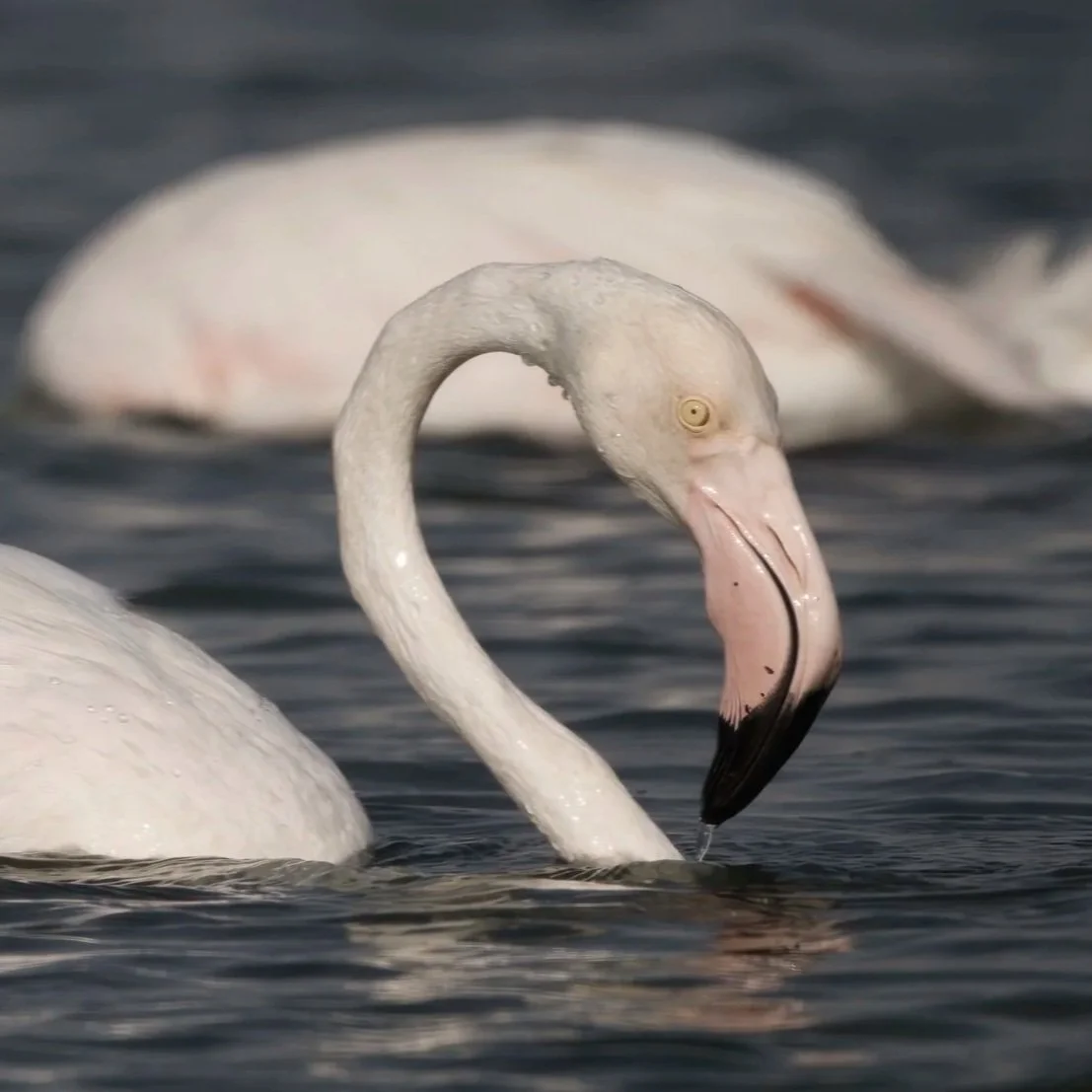 Flamingos feed upside down, filtering tiny organisms from the water using fine structures inside their beaks. Northern Shovelers use a wide, spoon-shaped beak with filtering edges to strain food from shallow water.