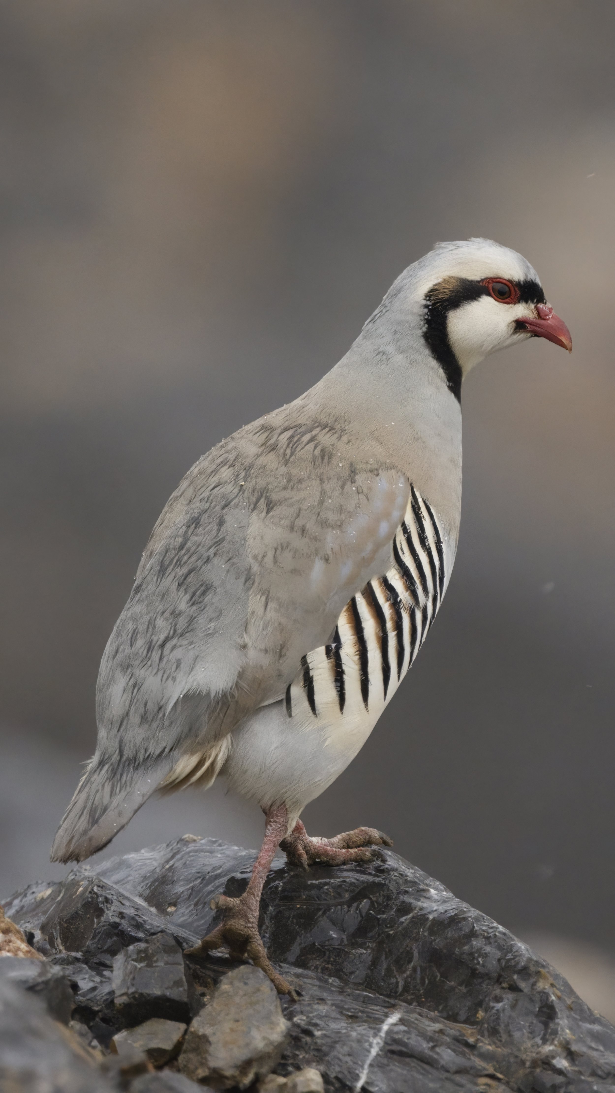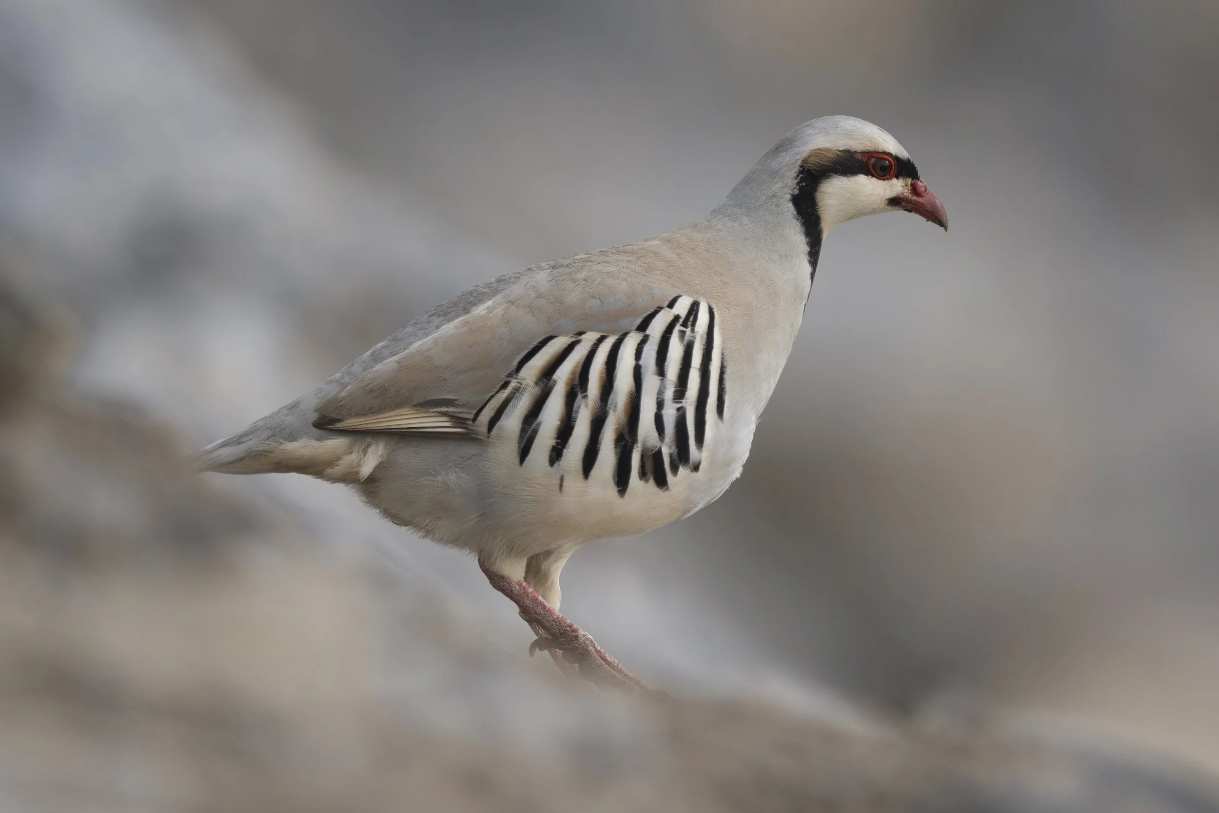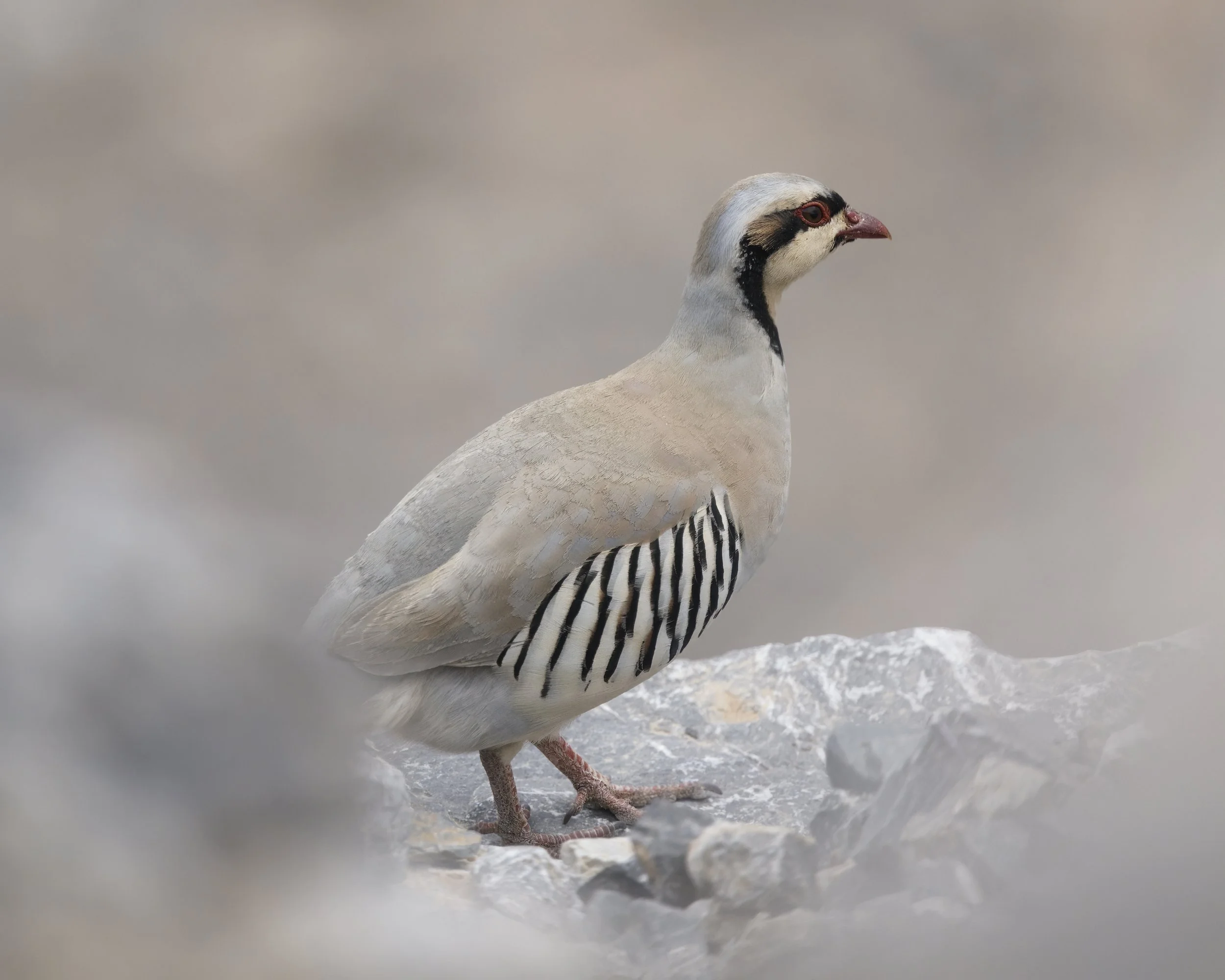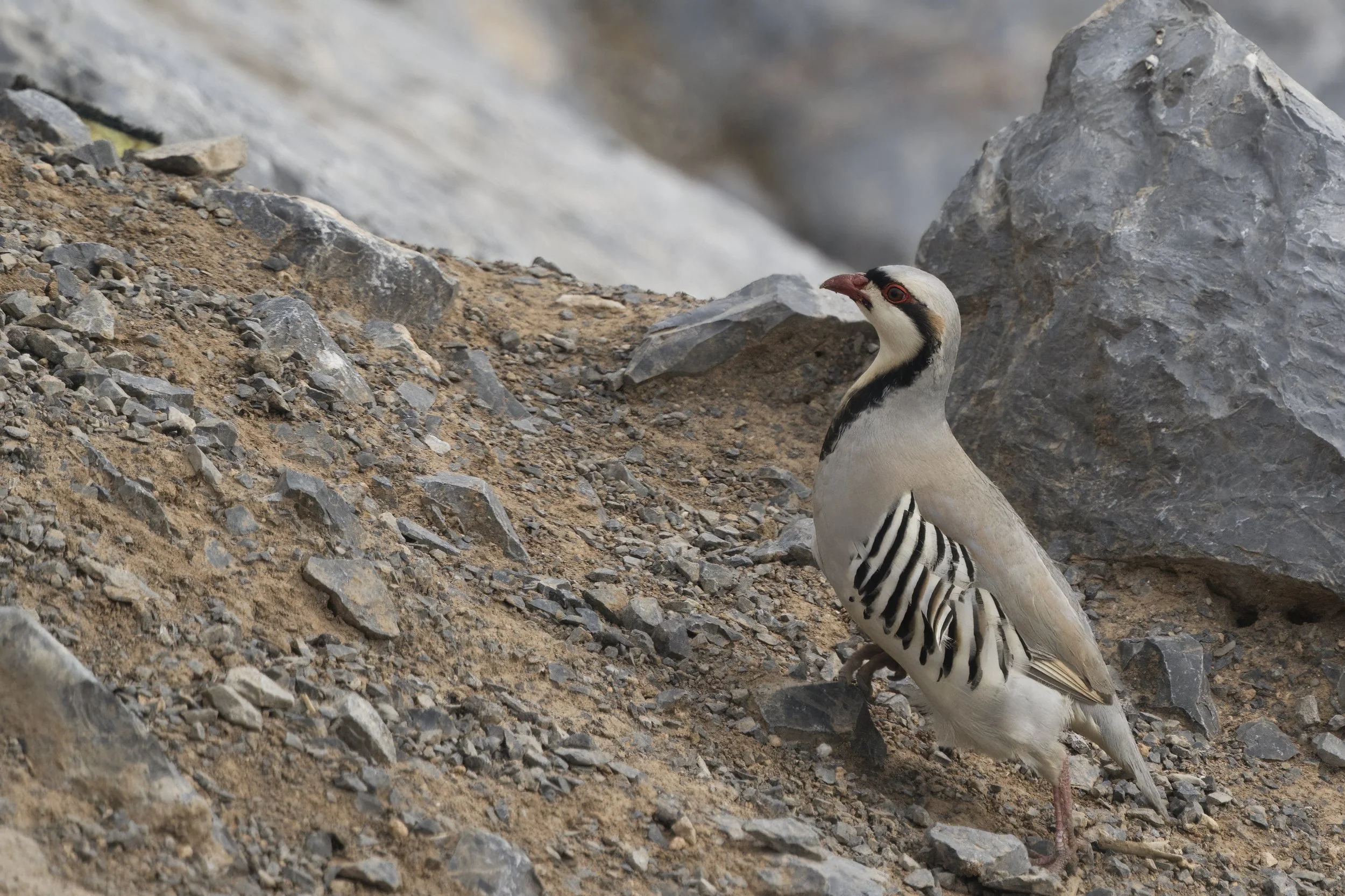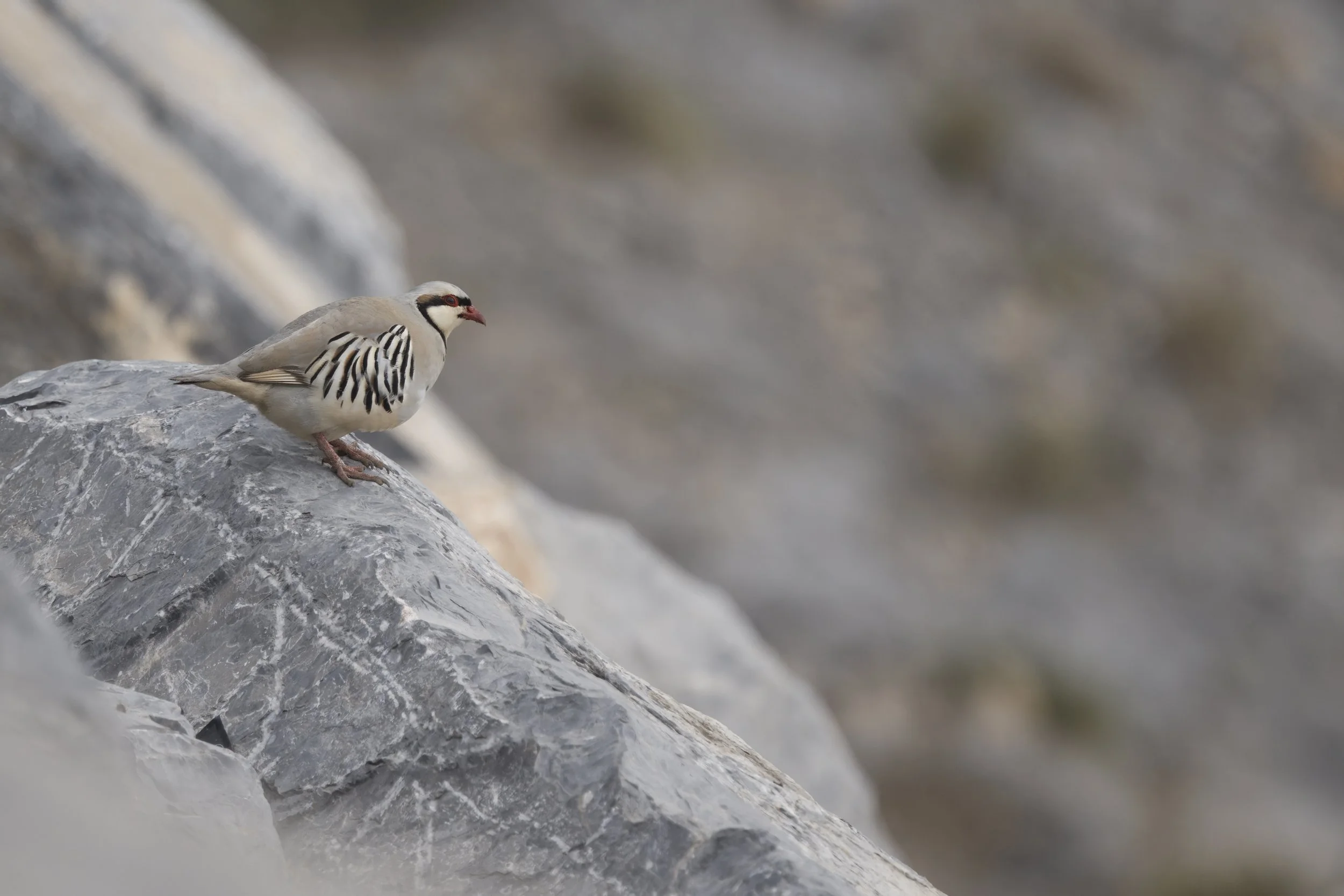 The Chukar (Alectoris chukar) is a medium-sized game bird in the pheasant family, widely distributed across rocky hillsides, mountainous regions, and arid landscapes of the Middle East, Central Asia, and parts of Europe. It is easily recognized by its bold black-and-white facial markings, buff-colored body, and striking black bars on its flanks. Adapted to rugged terrain, the Chukar is an agile runner, often seen scurrying up slopes rather than taking flight when disturbed. It primarily feeds on seeds, grasses, and small insects, foraging in small coveys. Known for its loud, repetitive calls, the species plays an important cultural role as a symbol of beauty and perseverance in many regions. In the UAE, Chukars are sometimes found in mountainous areas, where they blend seamlessly with the rocky surroundings.