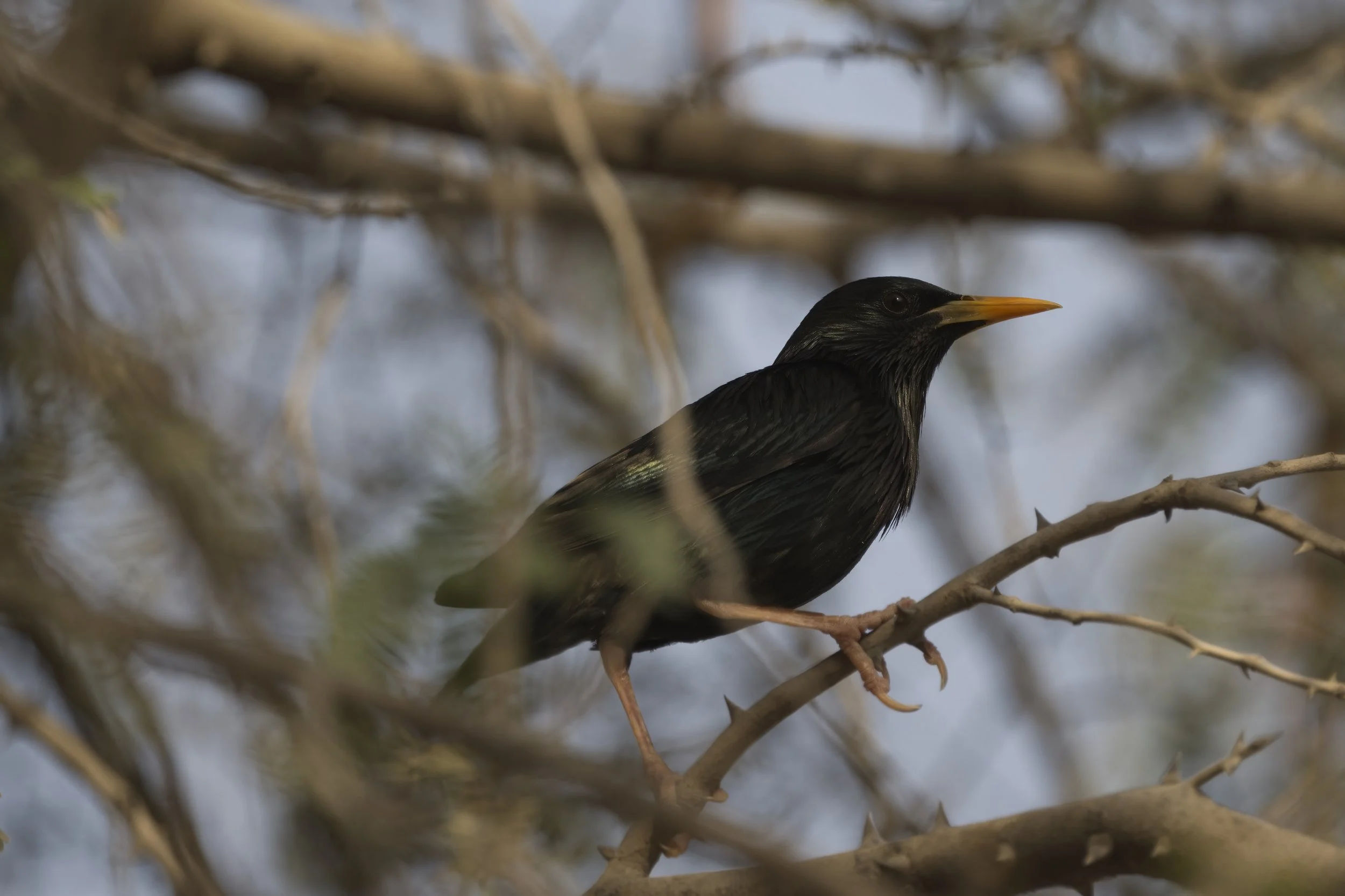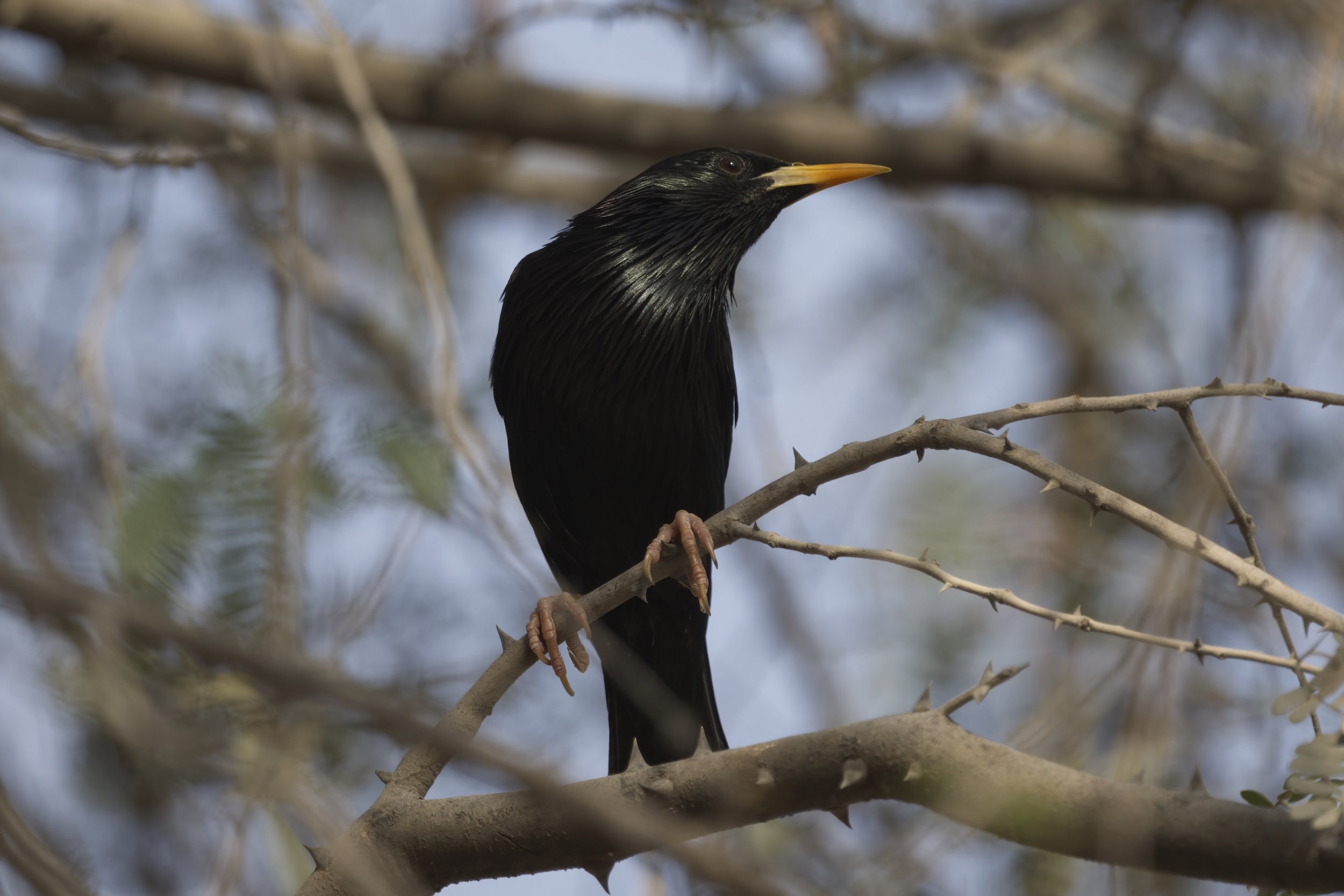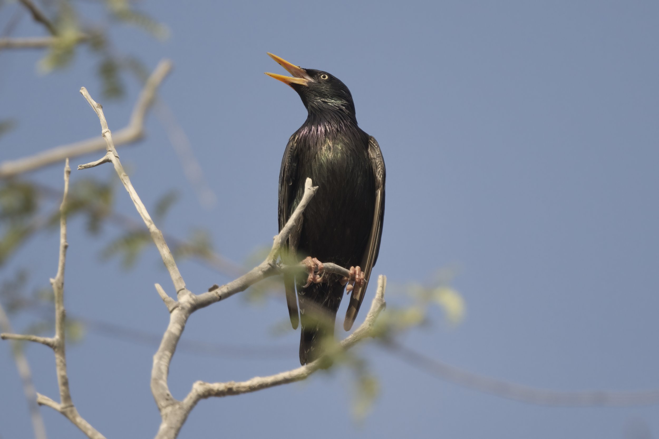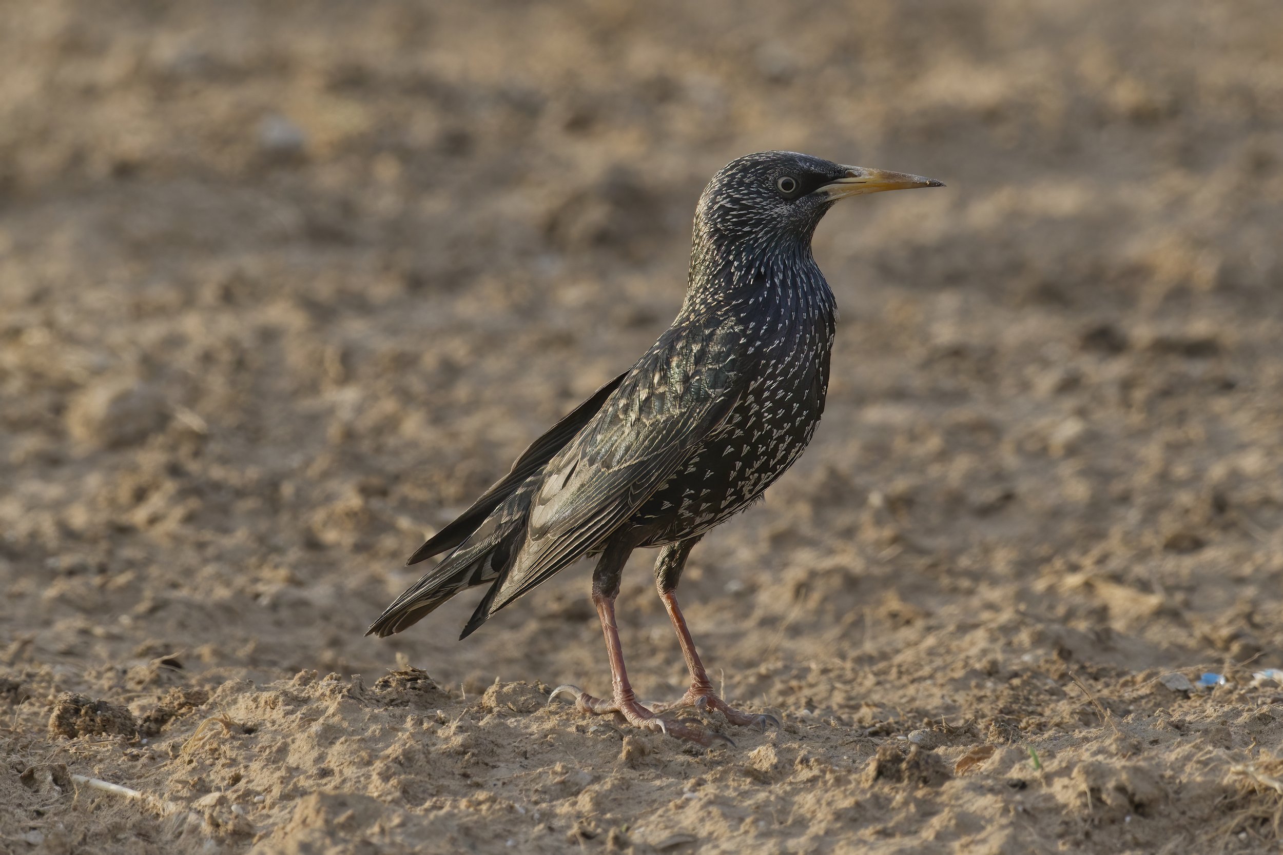 The Common Starling (Sturnus vulgaris) is primarily a winter visitor in the UAE, arriving from late October through March and often forming flocks of hundreds to thousands. You’ll find them foraging in cultivated fields, parks, mangrove fringes and irrigated gardens, where they glean insects, earthworms and fallen fruit. At dusk, starlings gather in spectacular murmurations—roosting communally in palm groves or mangrove stands (notably at Ras Al Khor)—before dispersing at first light. While true breeding populations are rare in the Emirates, a handful of pairs have been observed nesting in palm‐frond cavities and building crevices. Their glossy black plumage with an iridescent sheen, spotted winter speckling, and lively chattering calls make them one of the most eye-catching, gregarious passerines to grace the UAE’s winter skies.