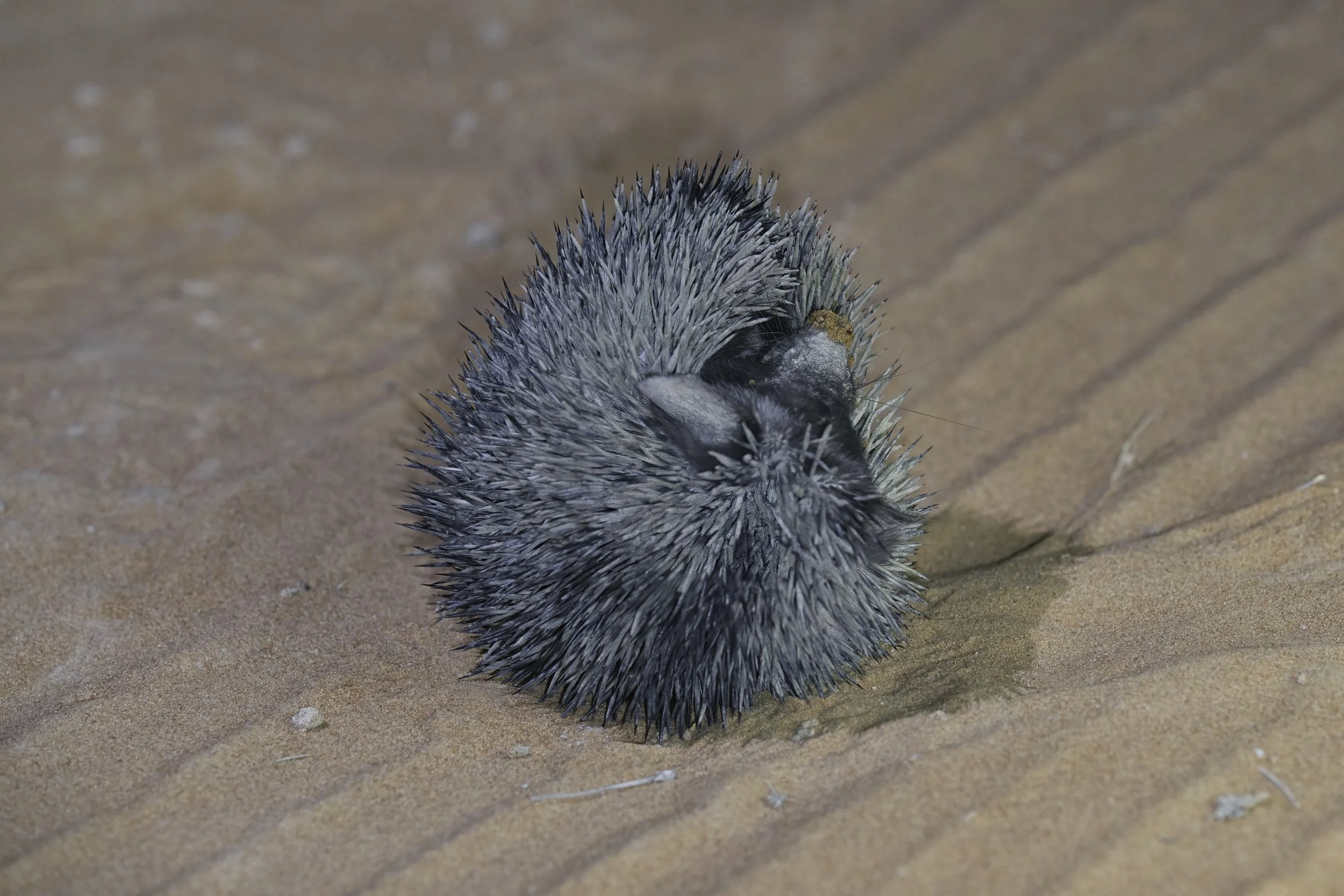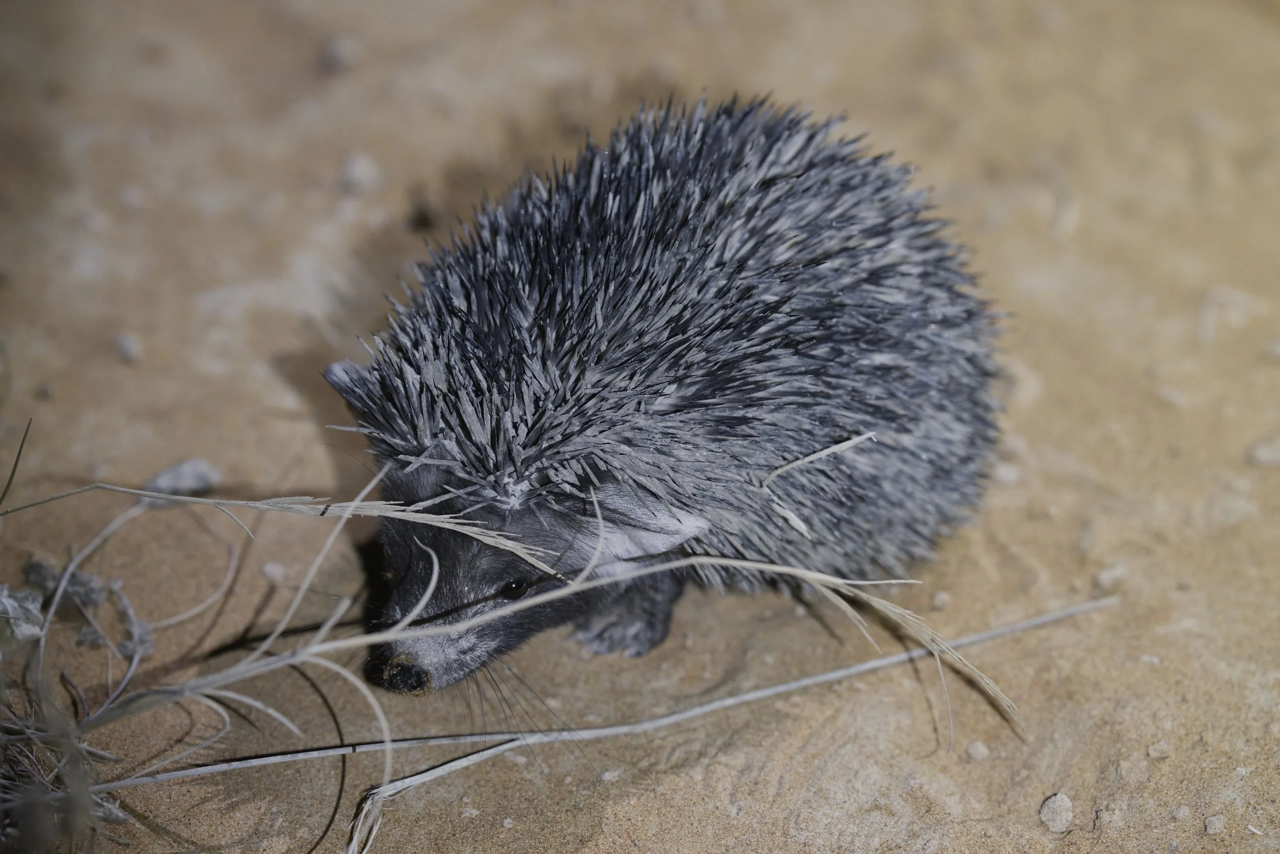 The Desert Hedgehog (Paraechinus aethiopicus) is one of the smallest hedgehog species, found across arid regions of the Middle East and North Africa, including the UAE. Perfectly adapted to desert life, it is nocturnal and spends the day hidden in burrows or under vegetation. At night, it forages for insects, small invertebrates, and even scorpions, making it an important part of the desert ecosystem. Its spiny coat protects it from predators, and when threatened, it curls tightly into a ball β€” a classic hedgehog defense.