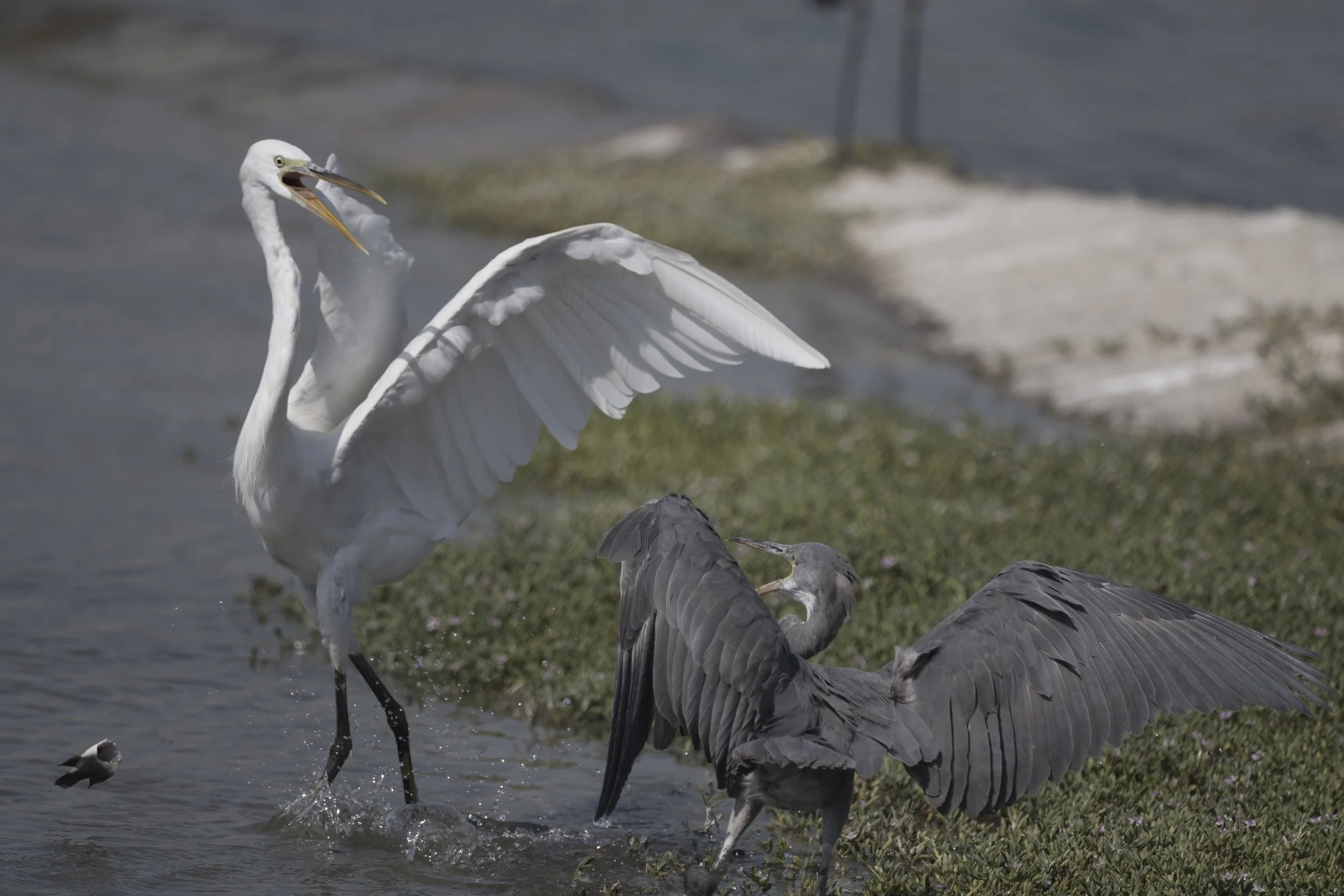Great Egret fighting off Western Reef Heron