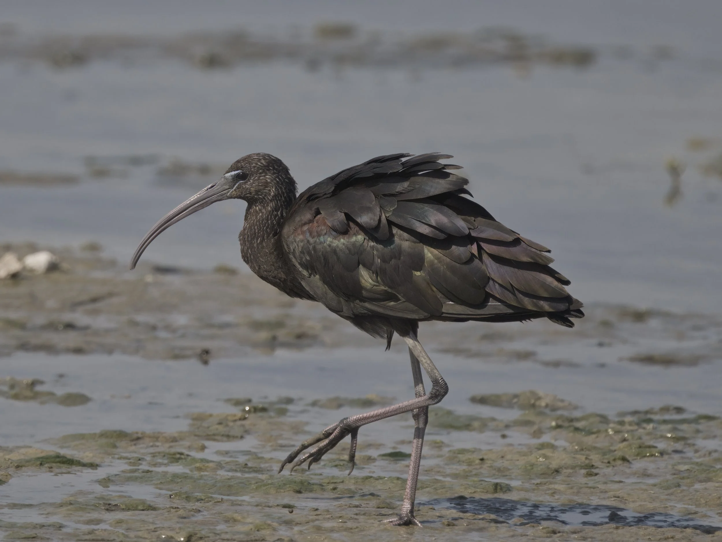 The Glossy Ibis (Plegadis falcinellus) is a medium-sized wading bird with a striking appearance, primarily recognized by its dark, iridescent plumage that shimmers with shades of green, bronze, and purple in the sunlight. Found in wetlands across Europe, Africa, Asia, and the Americas, this ibis prefers marshes, swamps, and estuaries for feeding and nesting. Its long, curved bill is well-adapted for probing into soft mud, where it feeds on insects, crustaceans, small fish, and amphibians. During the breeding season, its plumage takes on an even richer, glossy sheen. Social and gregarious, the Glossy Ibis often gathers in large flocks and is known for its graceful, deliberate movements in shallow waters.