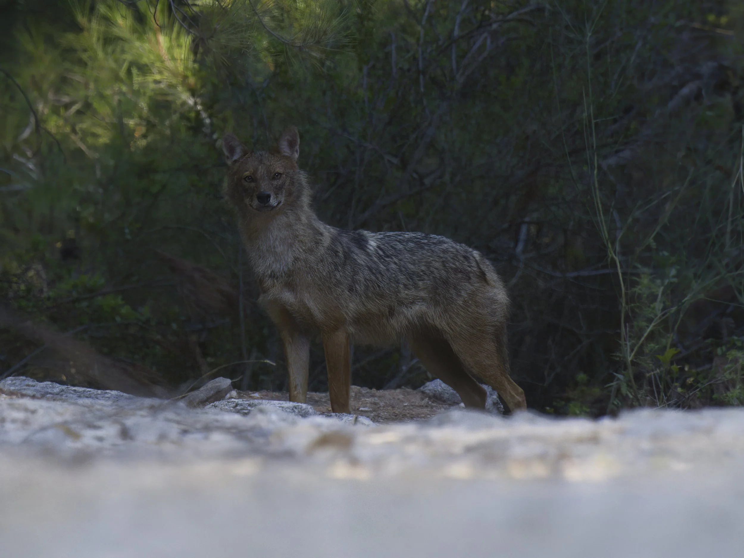 The Golden Jackal is a medium-sized carnivore resembling a small wolf or a large fox. It has a robust body with a reddish-gold to yellowish-brown coat that varies with the seasons and geography. The jackal’s fur is often grizzled with black, giving it a distinctive appearance. Its muzzle is narrow, ears are relatively large and pointed, and it has a bushy tail with a black tip.