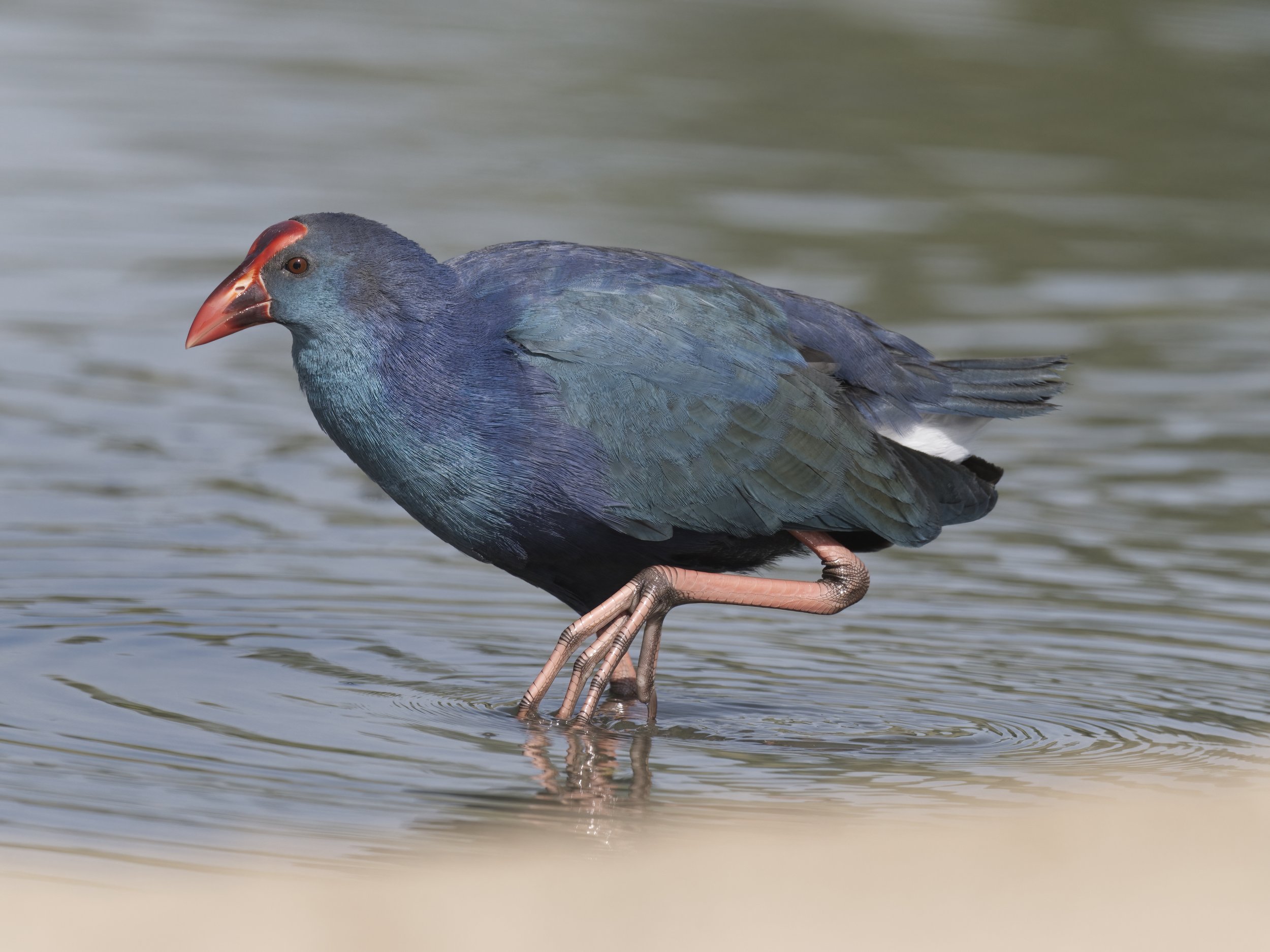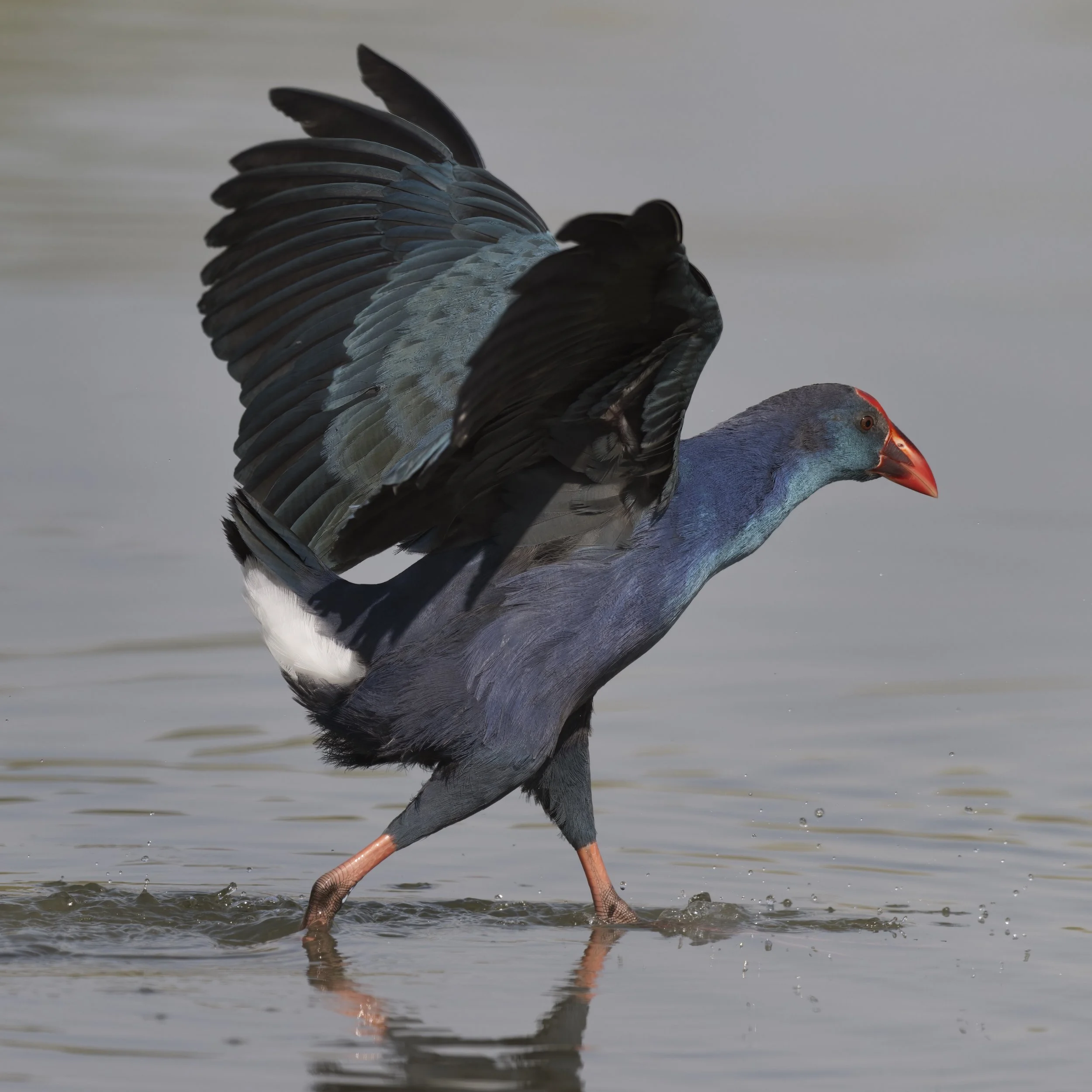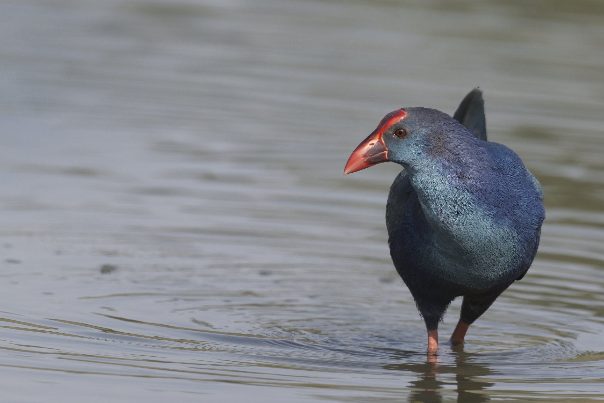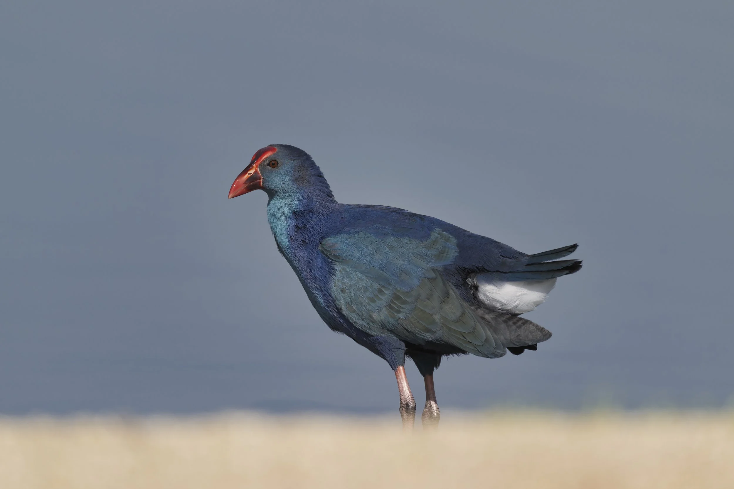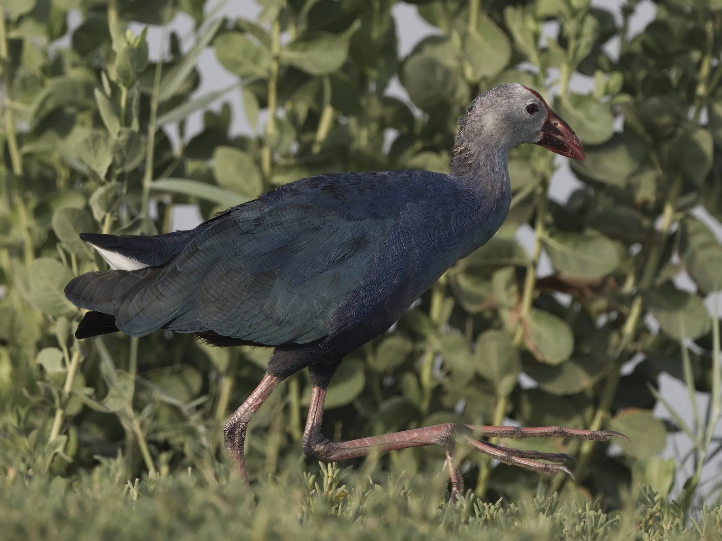 The Grey-headed Swamphen (Porphyrio poliocephalus) is a striking waterbird with vibrant blue-purple plumage, a gray head, and a prominent red bill and frontal shield. Found in wetlands, marshes, and reedbeds, this bird is well-adapted to freshwater habitats where dense aquatic vegetation provides food and cover. Native to South Asia, the Middle East, and Southeast Asia, it has also established populations in other regions, including the UAE.