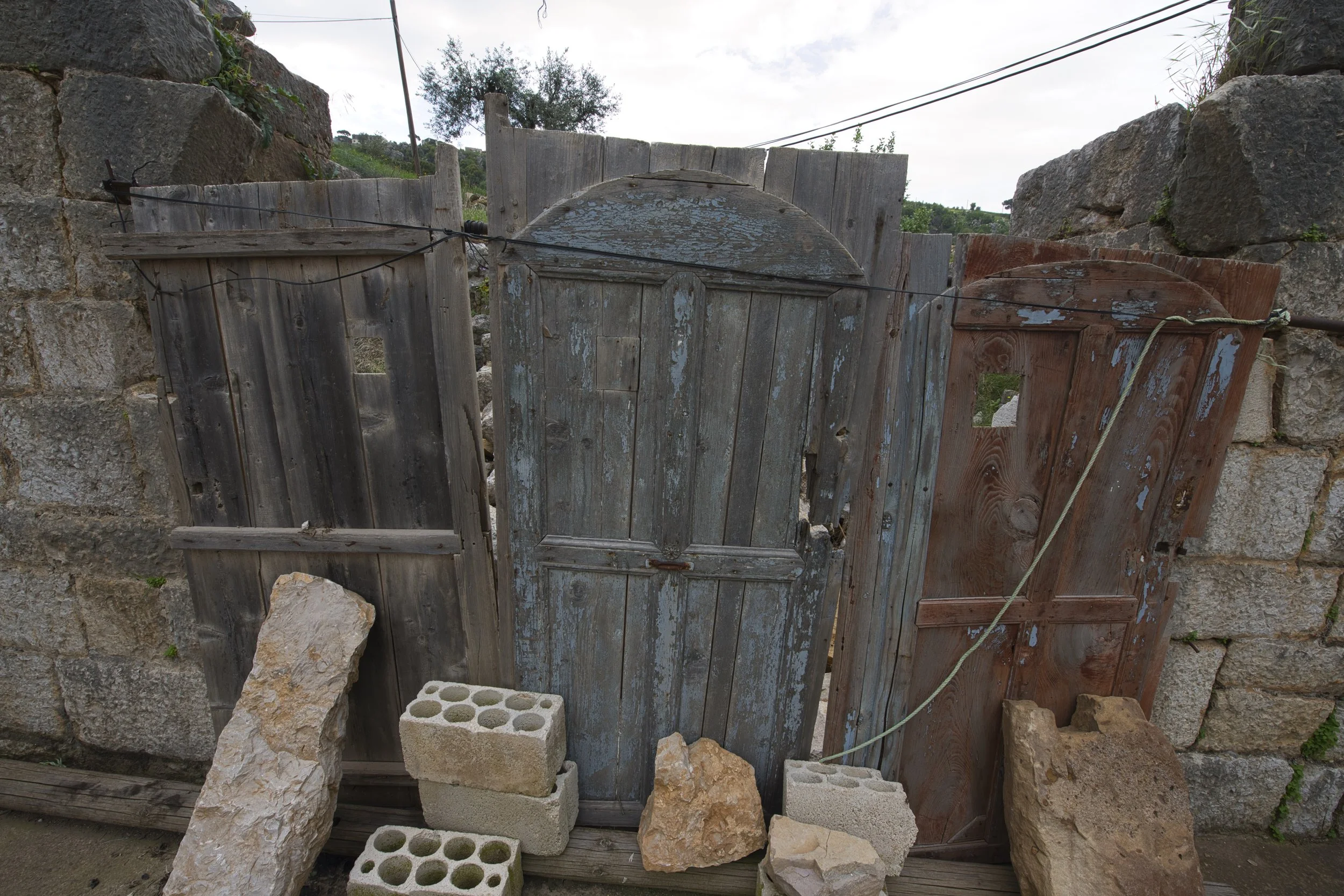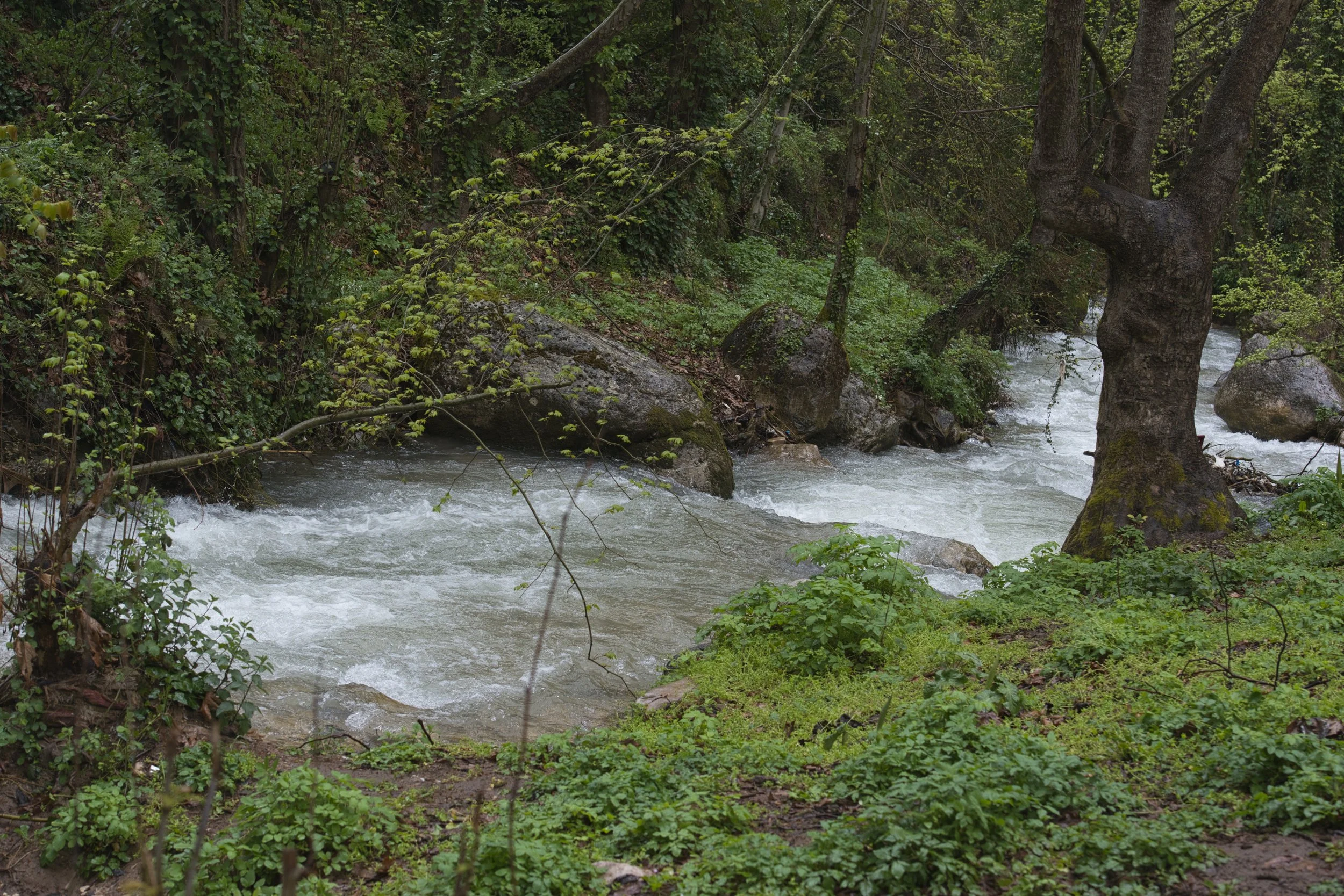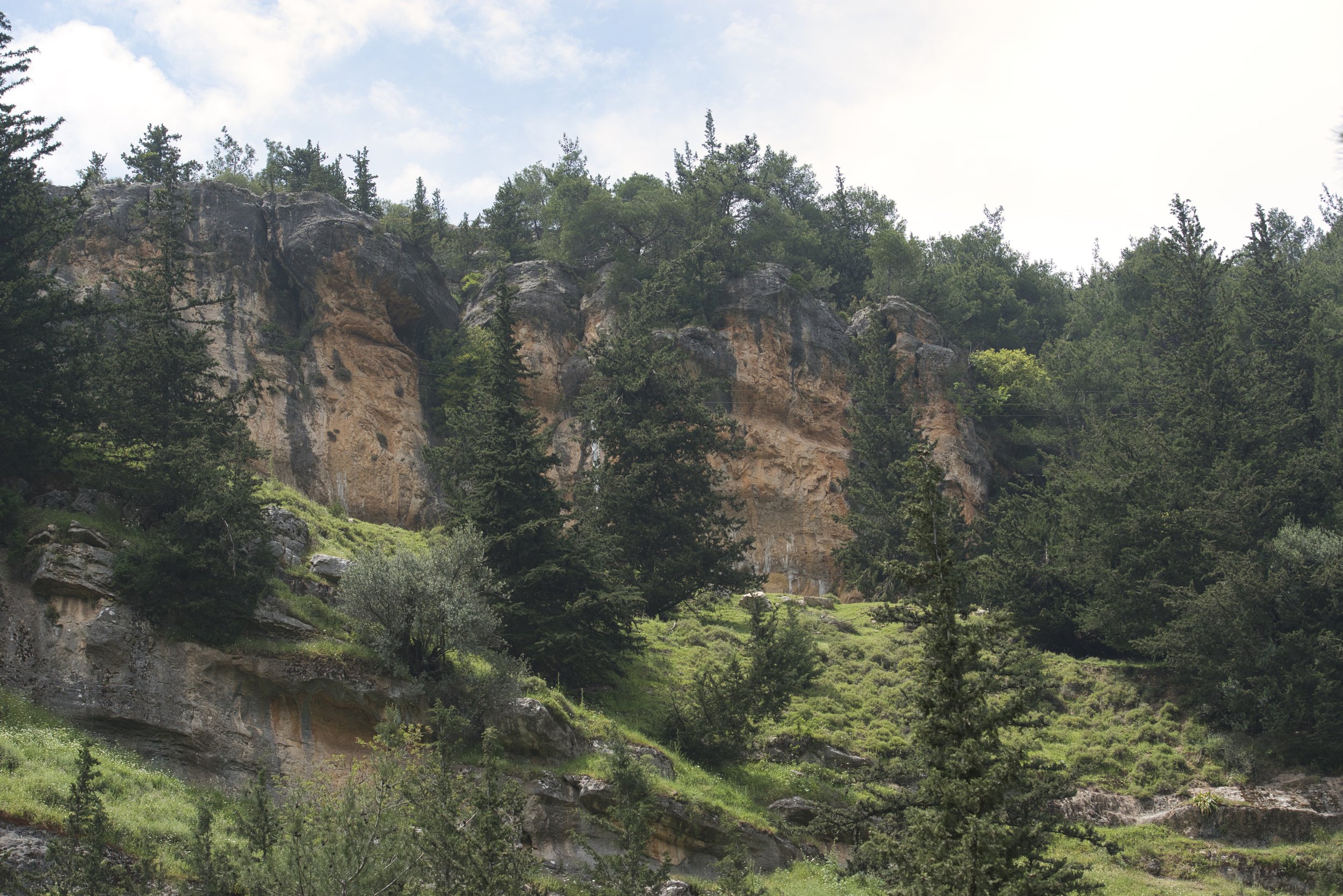 Hilly landscape with terraced fields, green trees, and houses with red roofs on the slopes, with mountains in the background.