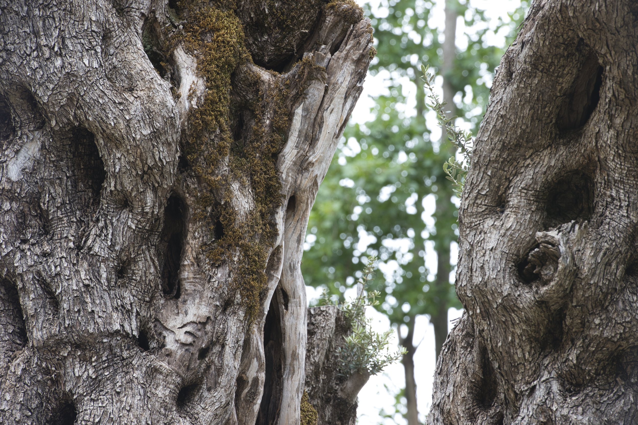 Close-up of two tree trunks with textured bark and small holes, with moss on the bark and a blurred background of green leaves.