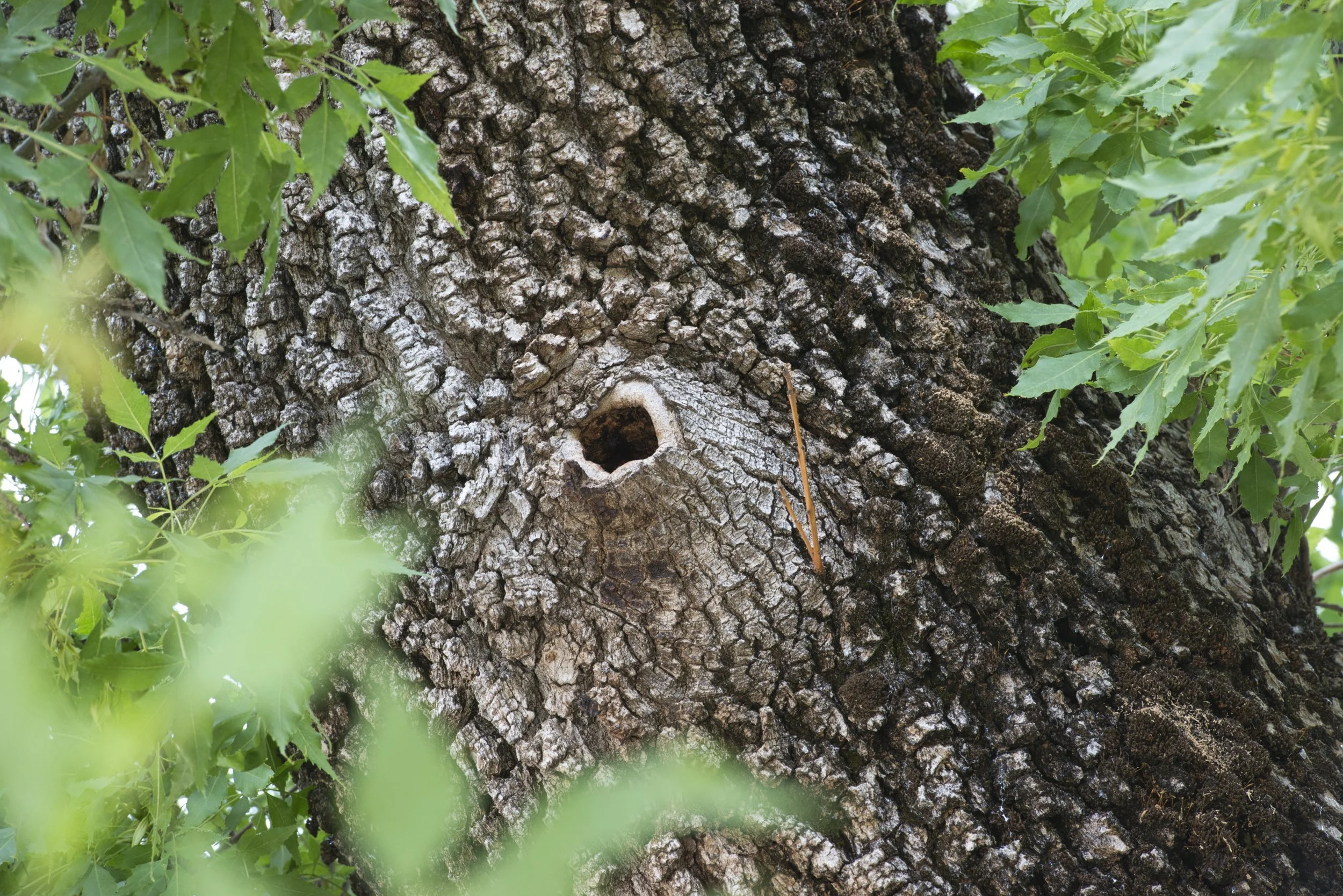 Close-up of a tree trunk with rough bark, a small hole, and green leaves surrounding it.