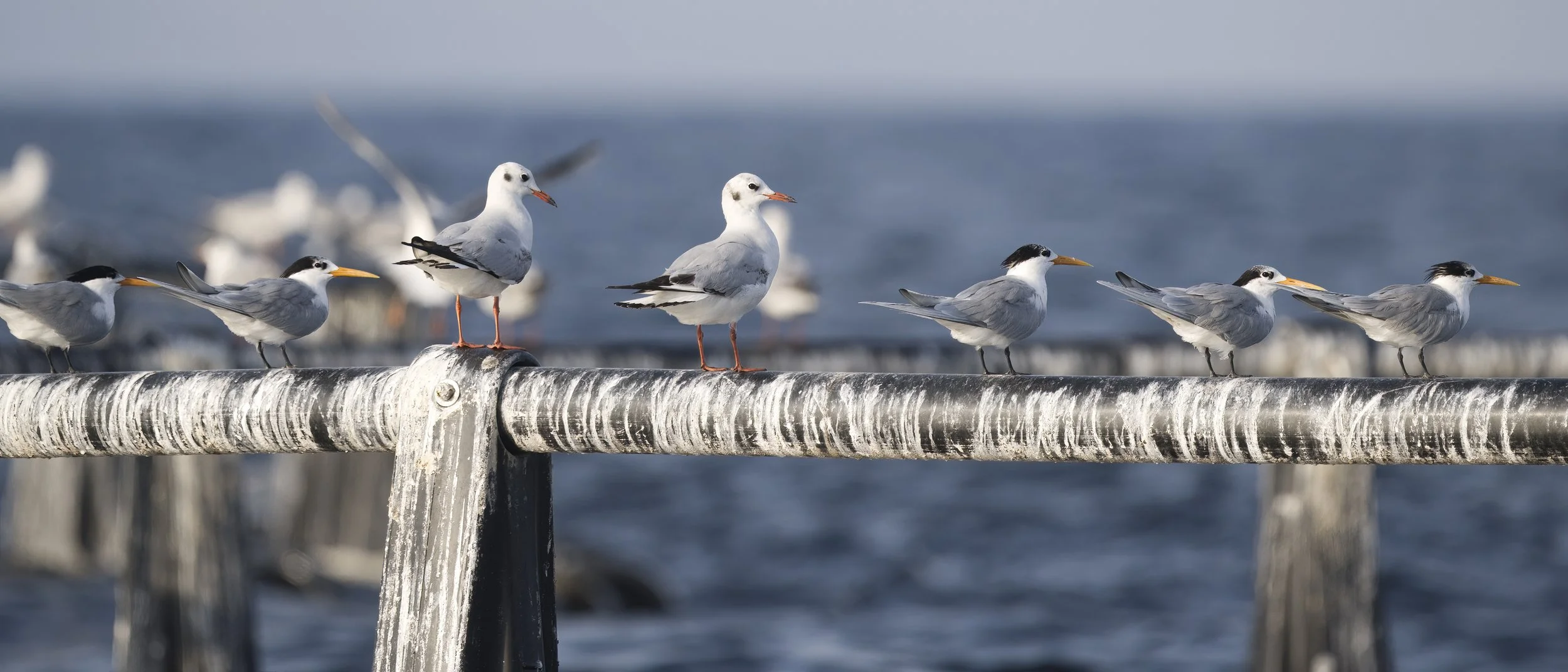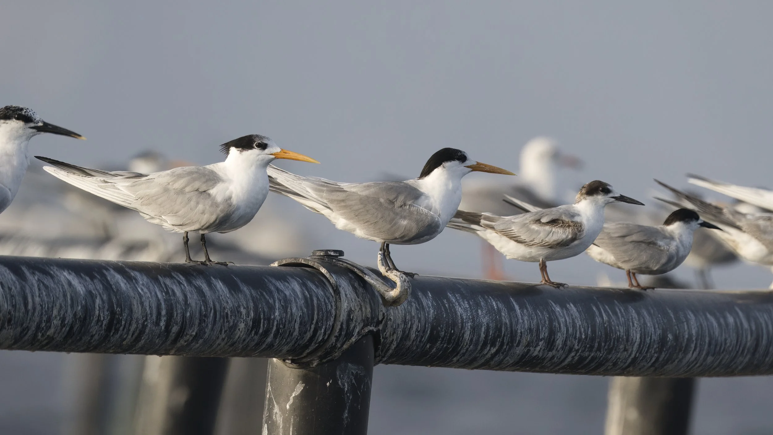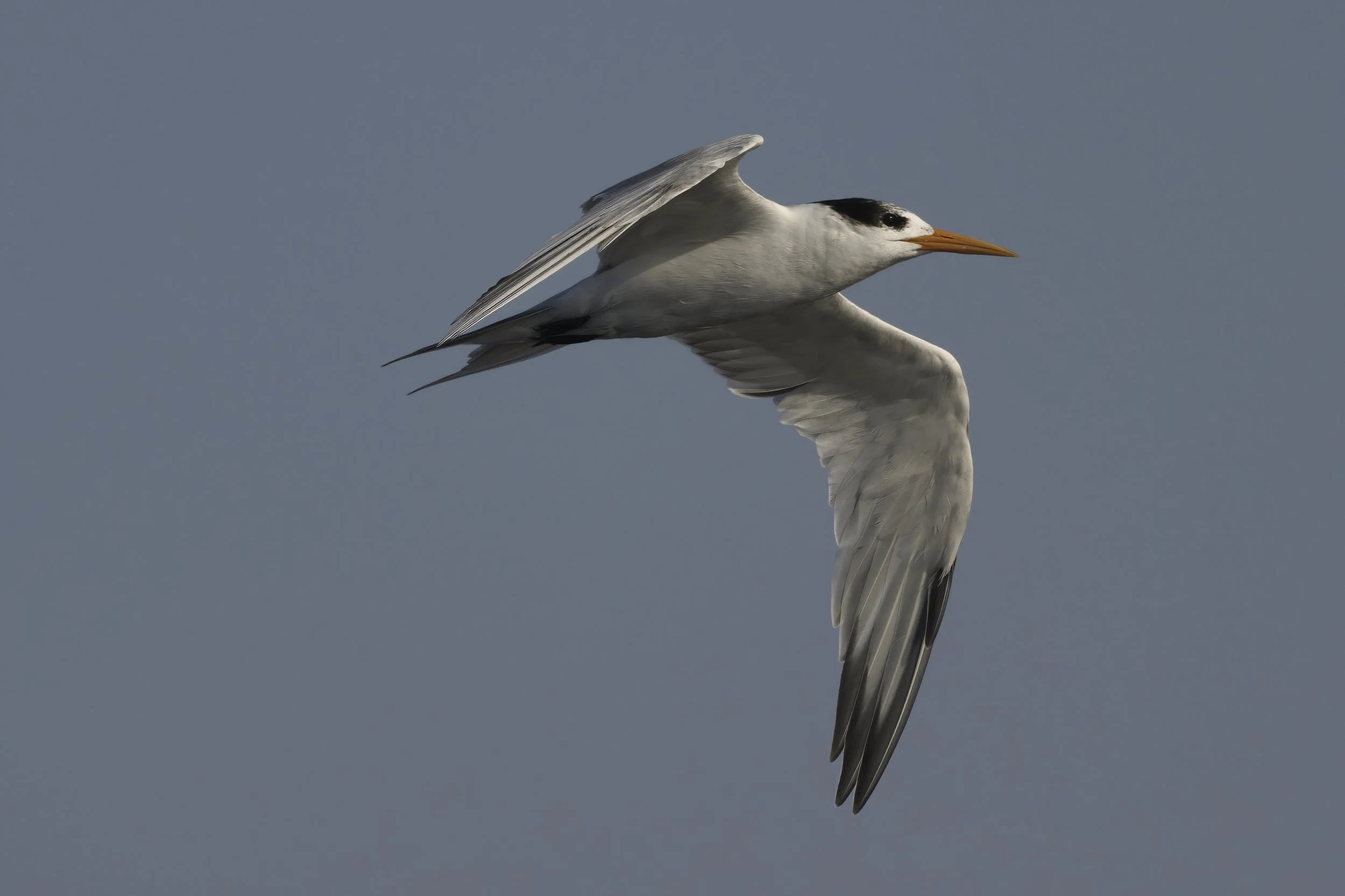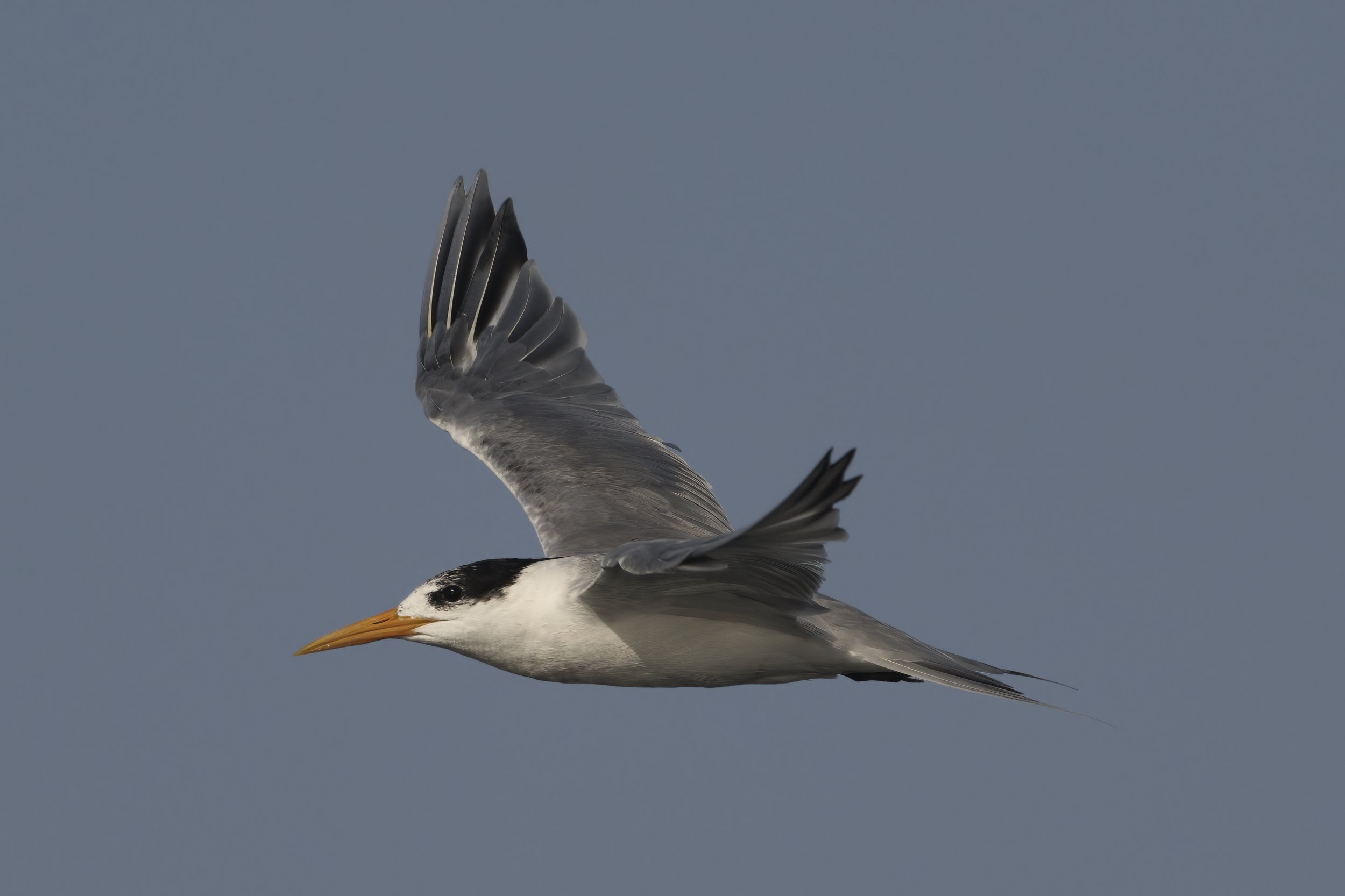 The Lesser Crested Tern (Thalasseus bengalensis) is a medium-sized seabird with a slender, elegant build. It has pale gray upperparts, white underparts, and a distinctive black cap that extends from its forehead to the back of its head during the breeding season. Its most striking feature is its bright orange bill, which helps differentiate it from similar tern species. Lesser Crested Terns are commonly found along tropical and subtropical coastlines, breeding in colonies on sandy islands and feeding primarily on small fish, which they catch by plunge-diving. They are regular visitors to the UAE’s coastal areas, particularly around offshore islands and sandbanks, making them an exciting species for birdwatchers and photographers in the region.