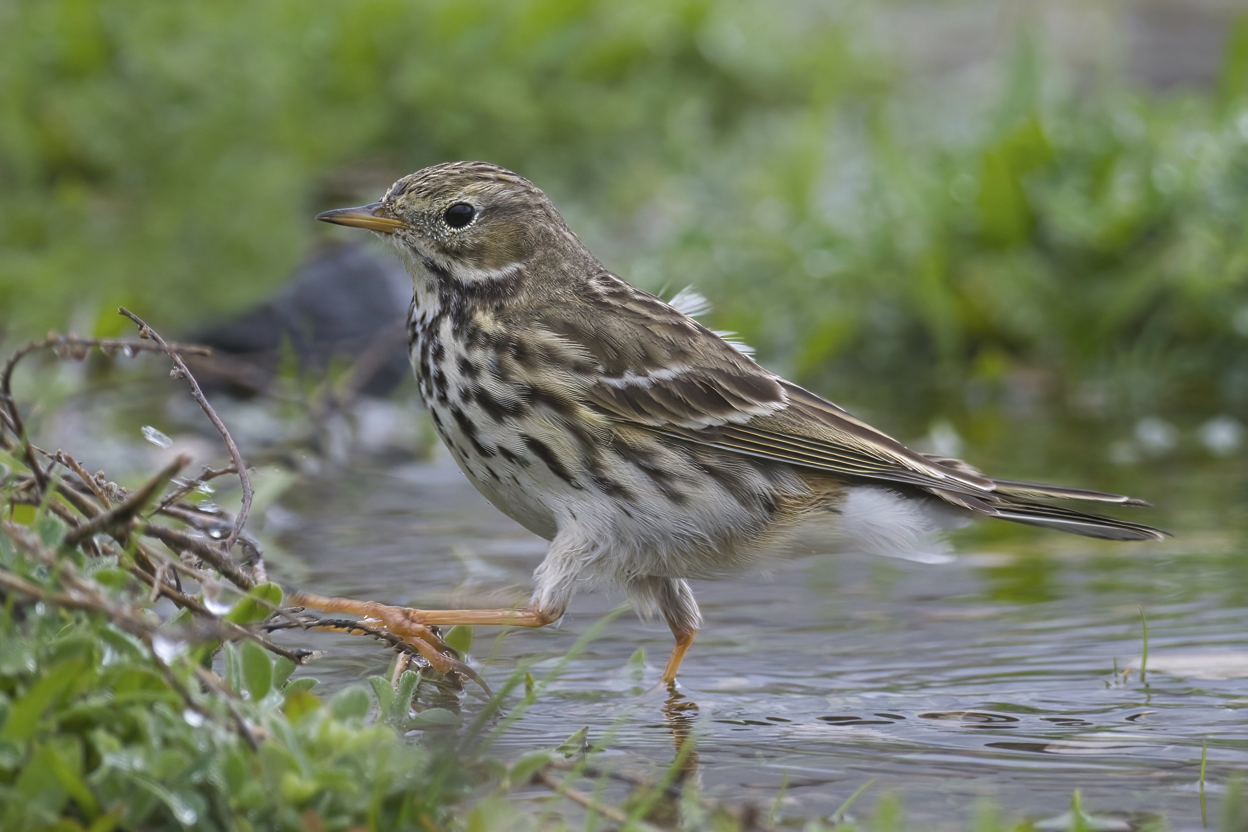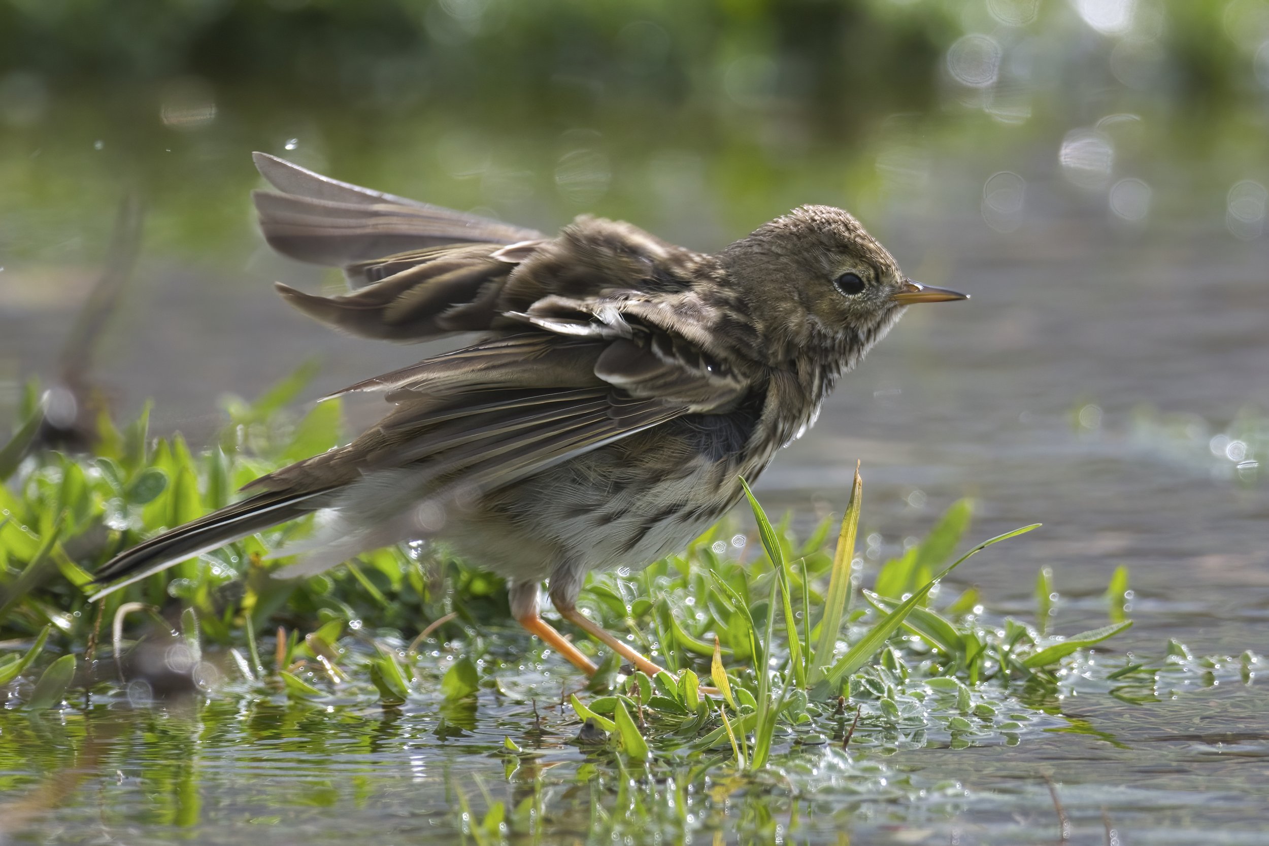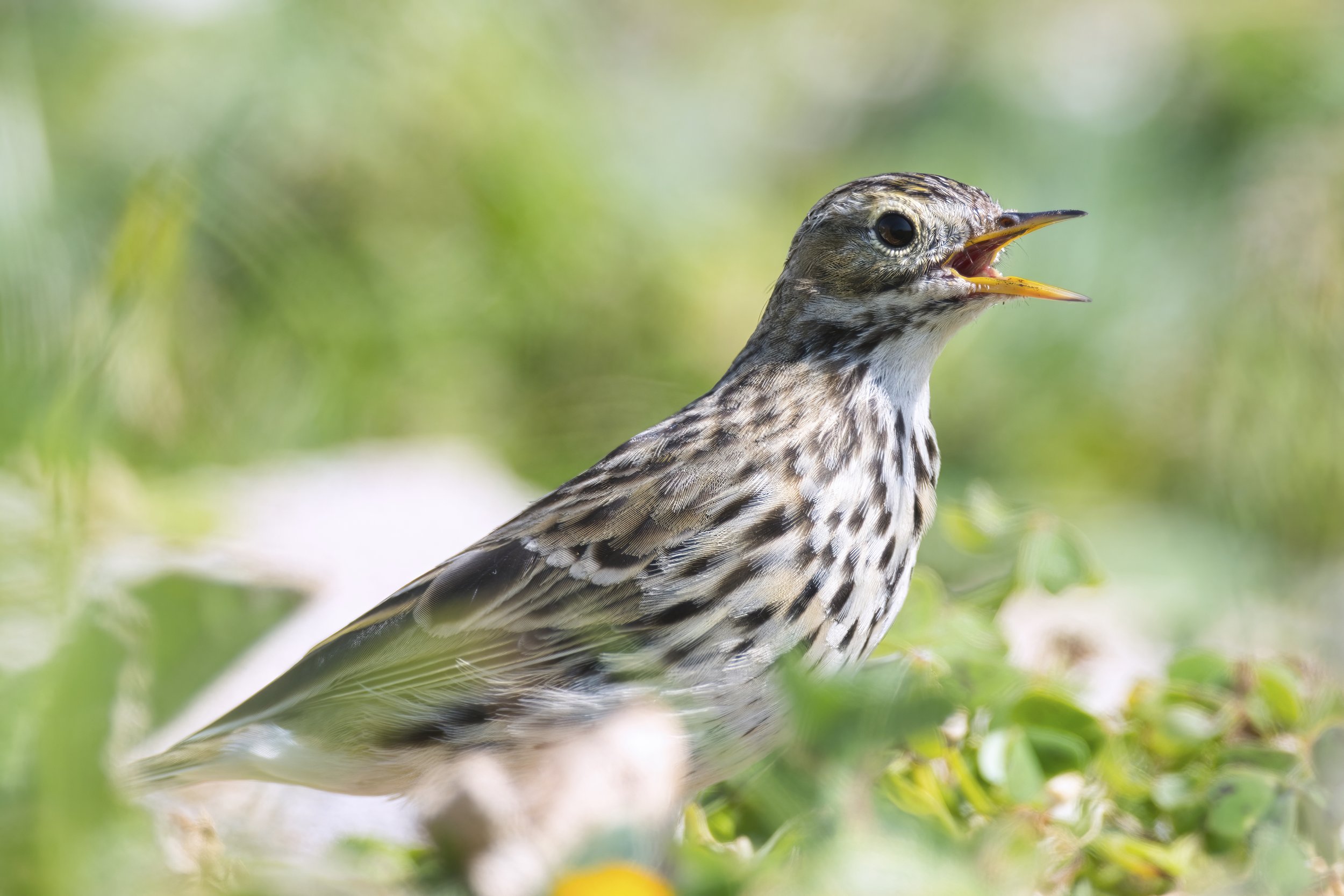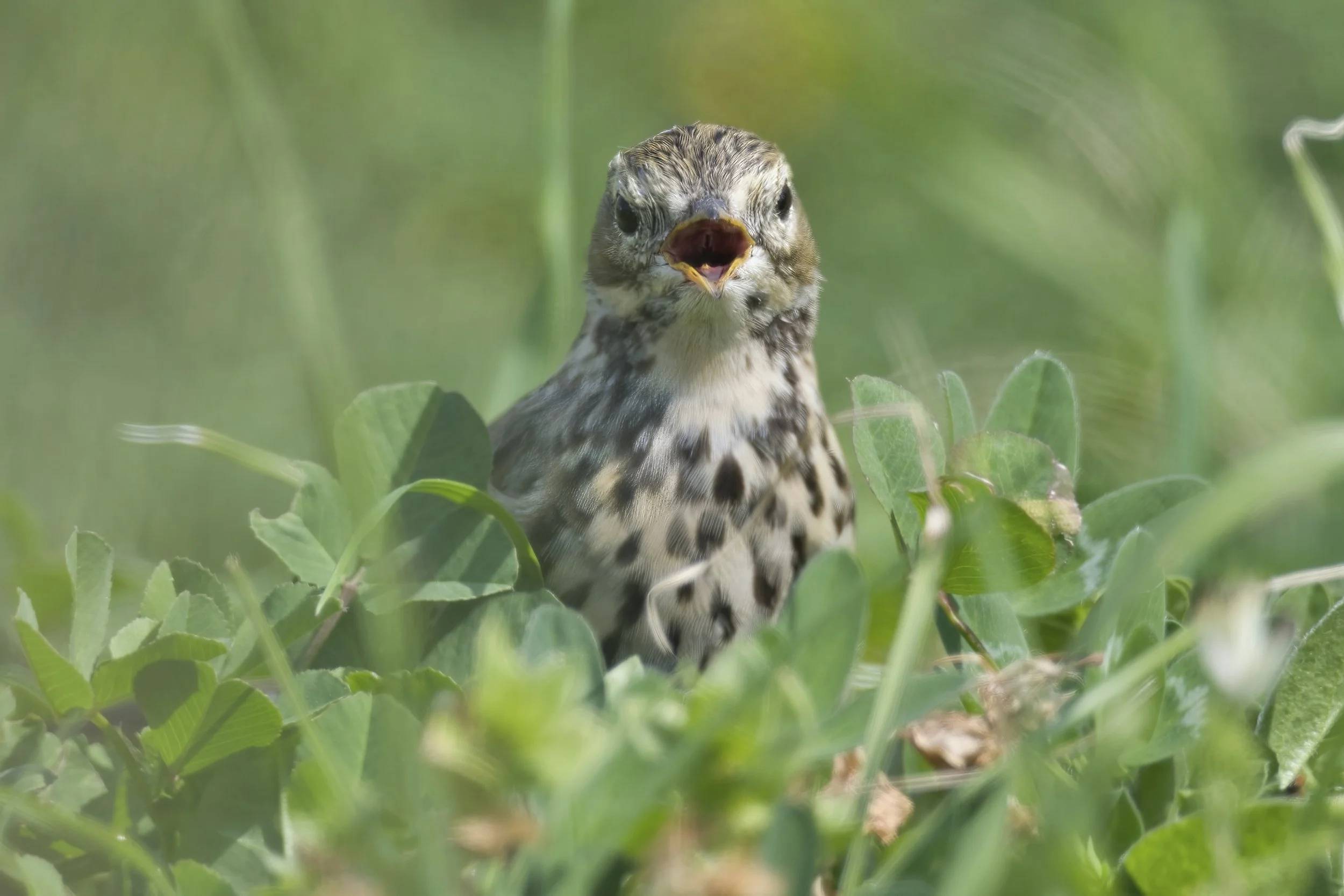 The Meadow Pipit (Anthus pratensis) is a small, slender bird commonly found in open grasslands, meadows, and heathlands across Europe and western Asia. It is easily recognized by its streaky brown plumage, pale underside with fine dark streaks, and its characteristic thin beak, adapted for an insectivorous diet. During flight, its undulating movement and high-pitched "tsip-tsip" calls are distinctive.