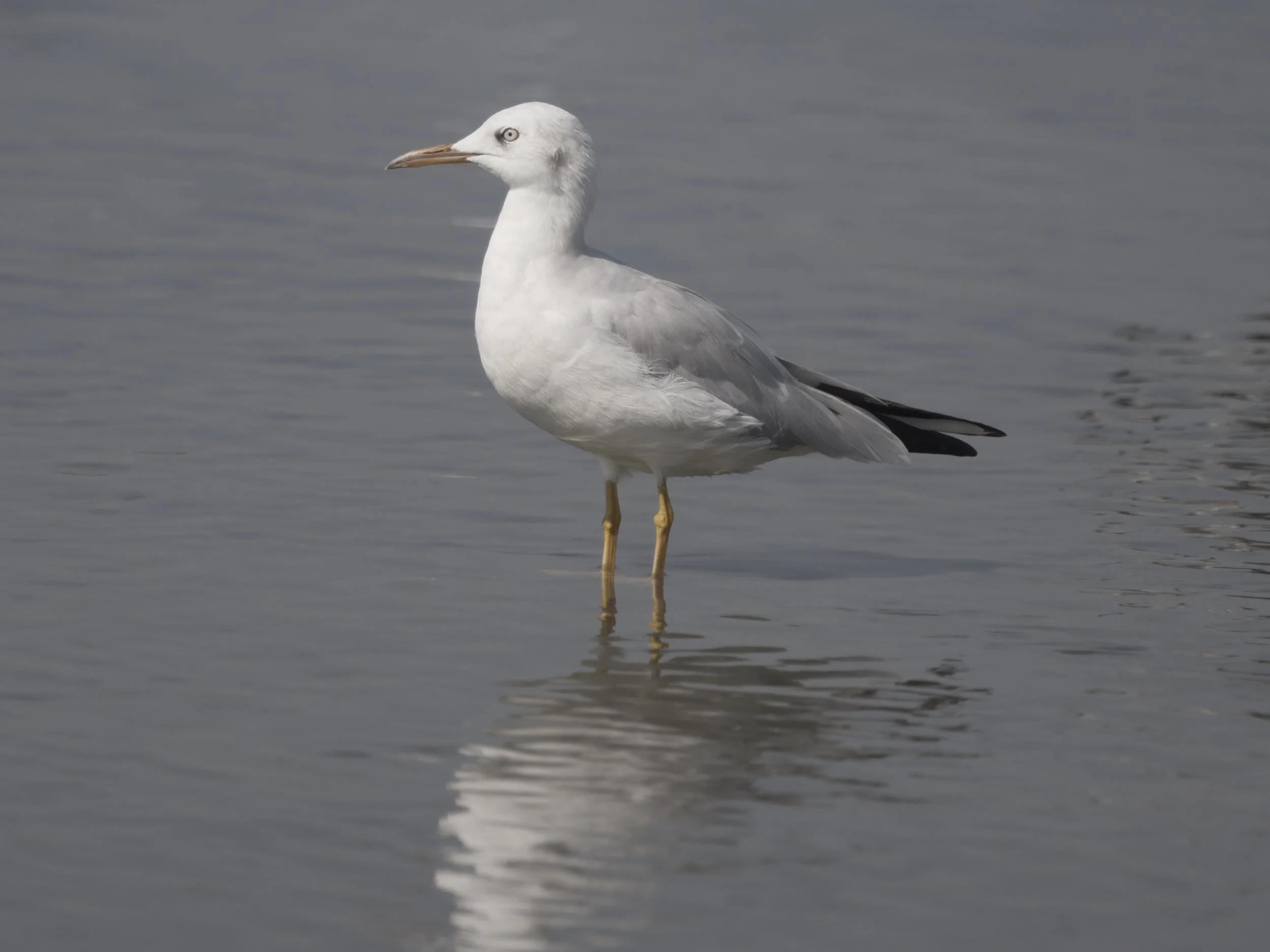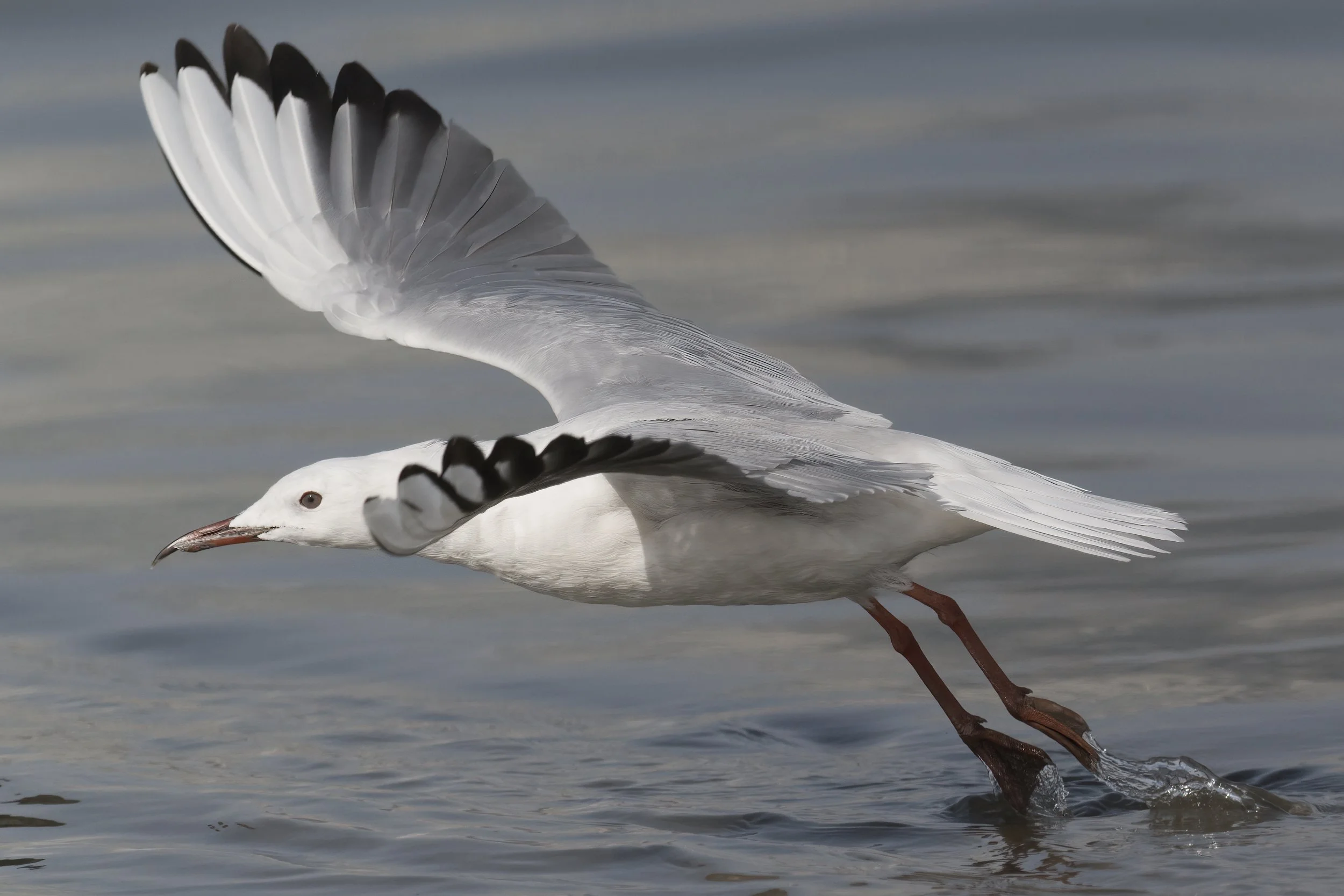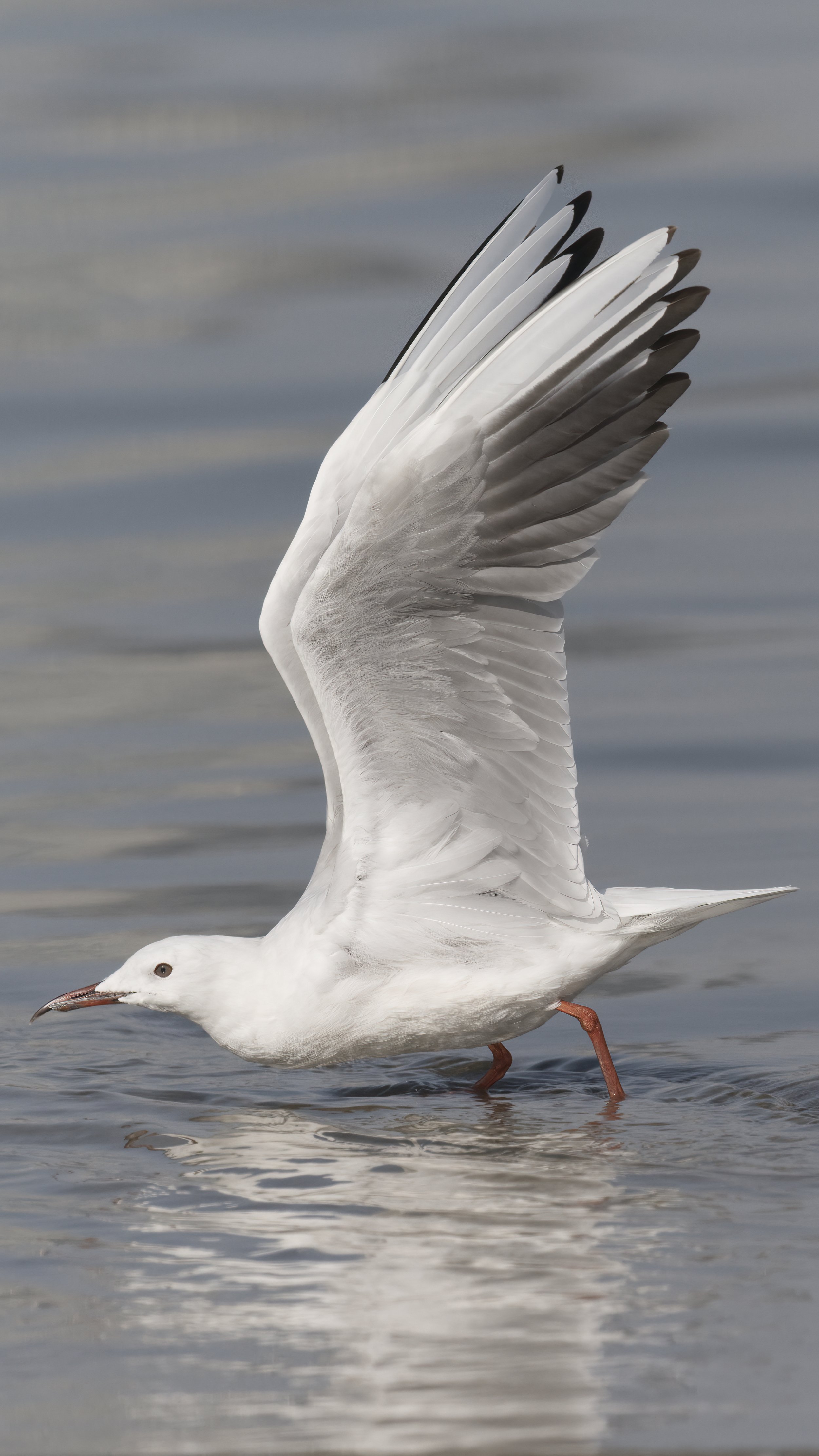 In breeding plumage, its head takes on a soft pink tinge, while the rest of its body is primarily white with a pale grey back and wings. Its legs and feet are a matching reddish-pink, adding to its graceful look. During the non-breeding season, the gull loses the pinkish hue and becomes more uniformly pale. The eyes are dark, giving it an alert expression, and its wings feature distinctive black wingtips visible during flight.