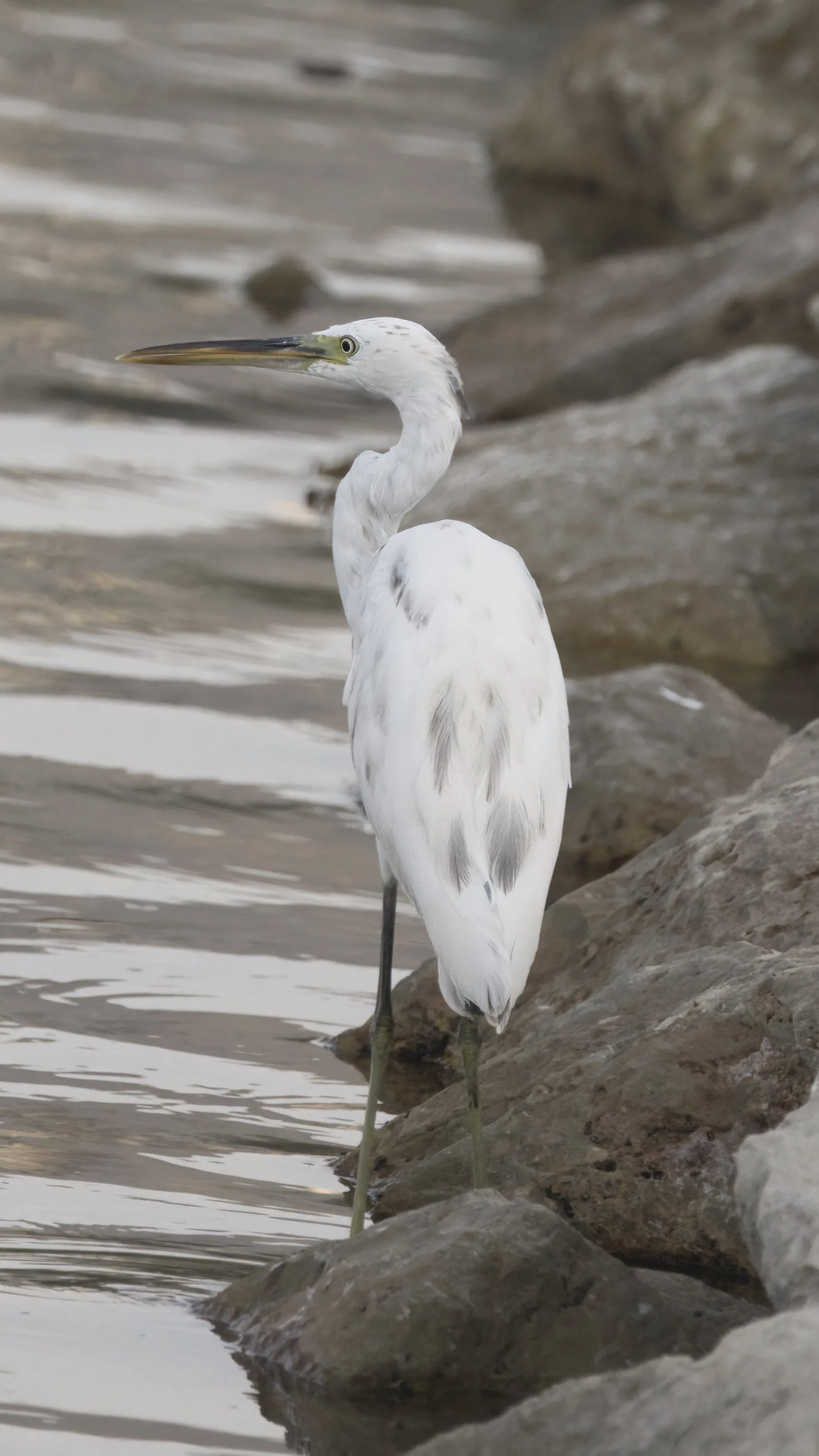 The Western Reef Heron (Egretta gularis) is a medium-sized heron commonly found in coastal regions of the Middle East, including the UAE. It has two color morphs—either entirely white or dark slate-gray—with both morphs featuring long legs and a slender, sharp bill. This species is often seen in shallow waters, mudflats, and mangroves, where it forages for fish, crustaceans, and small invertebrates. The Western Reef Heron is highly adaptable and is a frequent resident of wetlands and coastal areas throughout the region.
