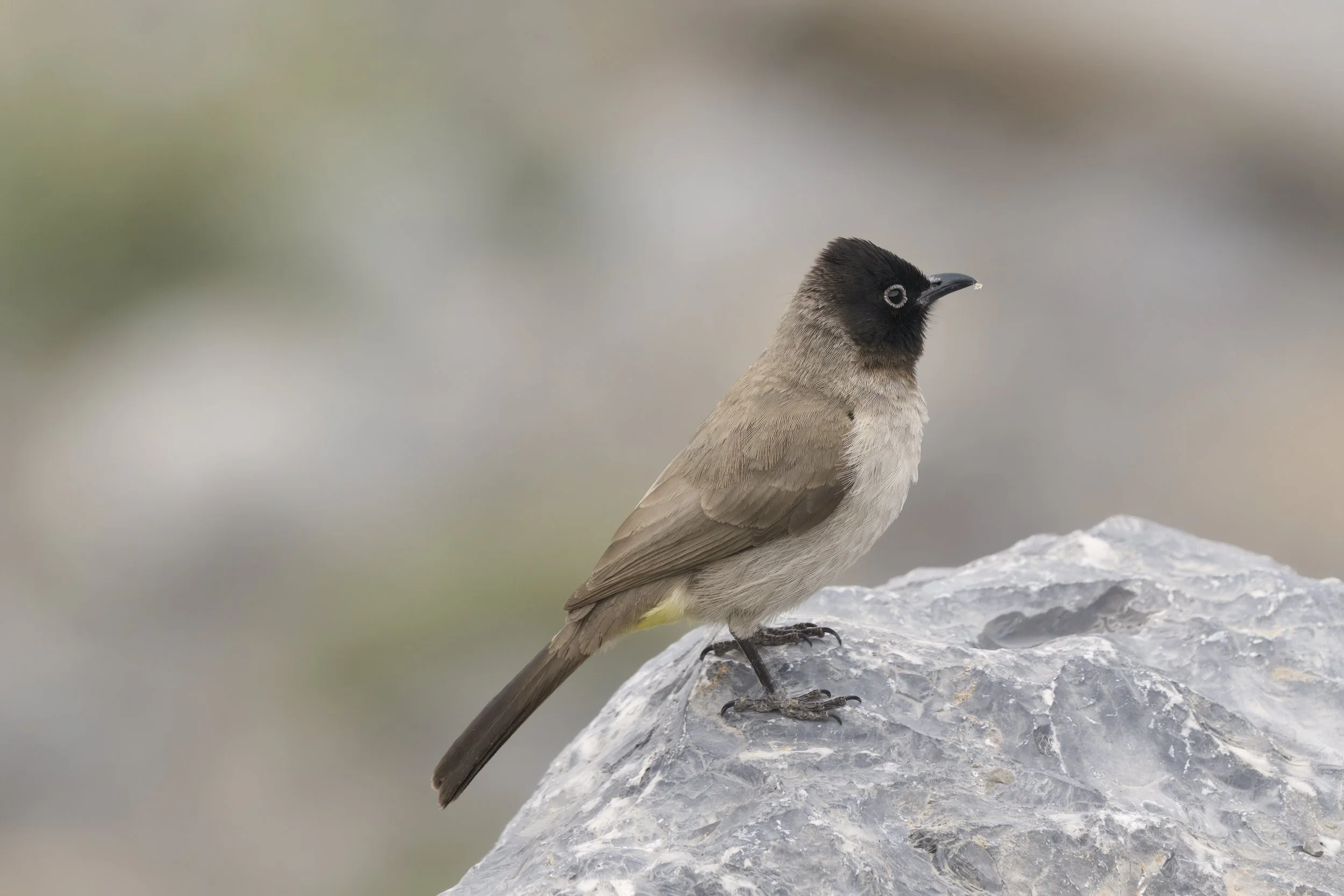 In Lebanon, the White-spectacled Bulbul (Pycnonotus xanthopygos) is a common and well-loved resident bird found across the country's diverse landscapes. From coastal gardens to mountainous regions, this adaptable species thrives in various habitats, including urban parks, agricultural areas, and Mediterranean scrublands. Its distinctive appearance—dark head with a white eye-ring, olive-brown body, and vibrant yellow undertail—makes it easy to spot, even for novice birdwatchers.